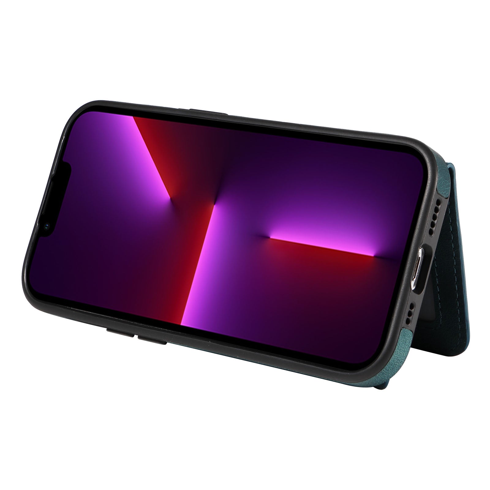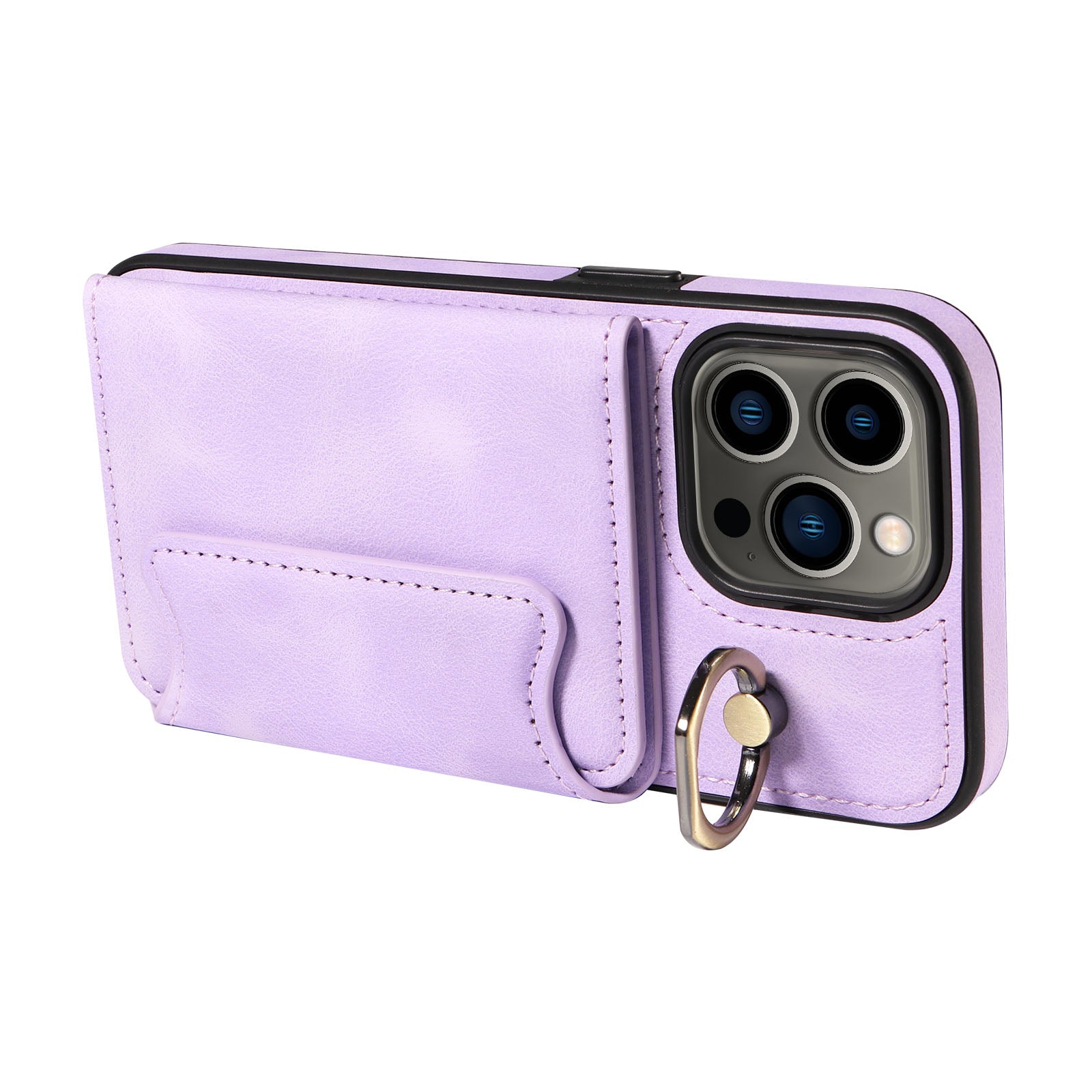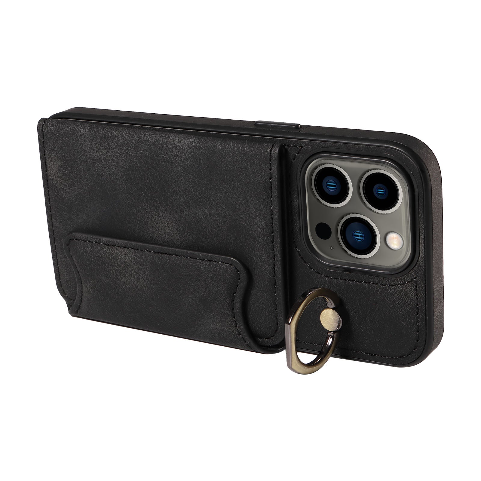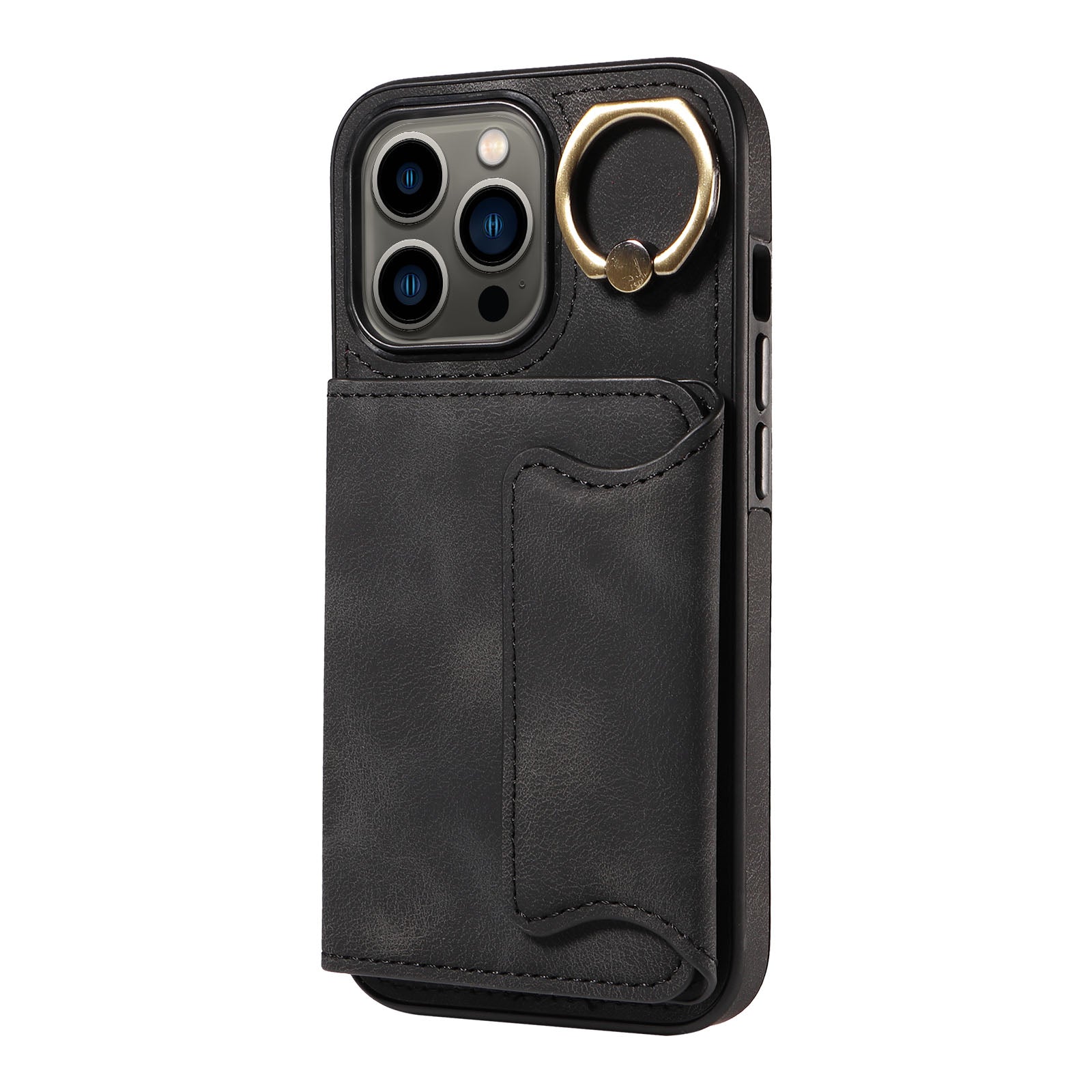 001 For iPhone 13 Pro 6.1 inch Card Holder PU Leather Coated TPU Cover Ring Kickstand Phone Case