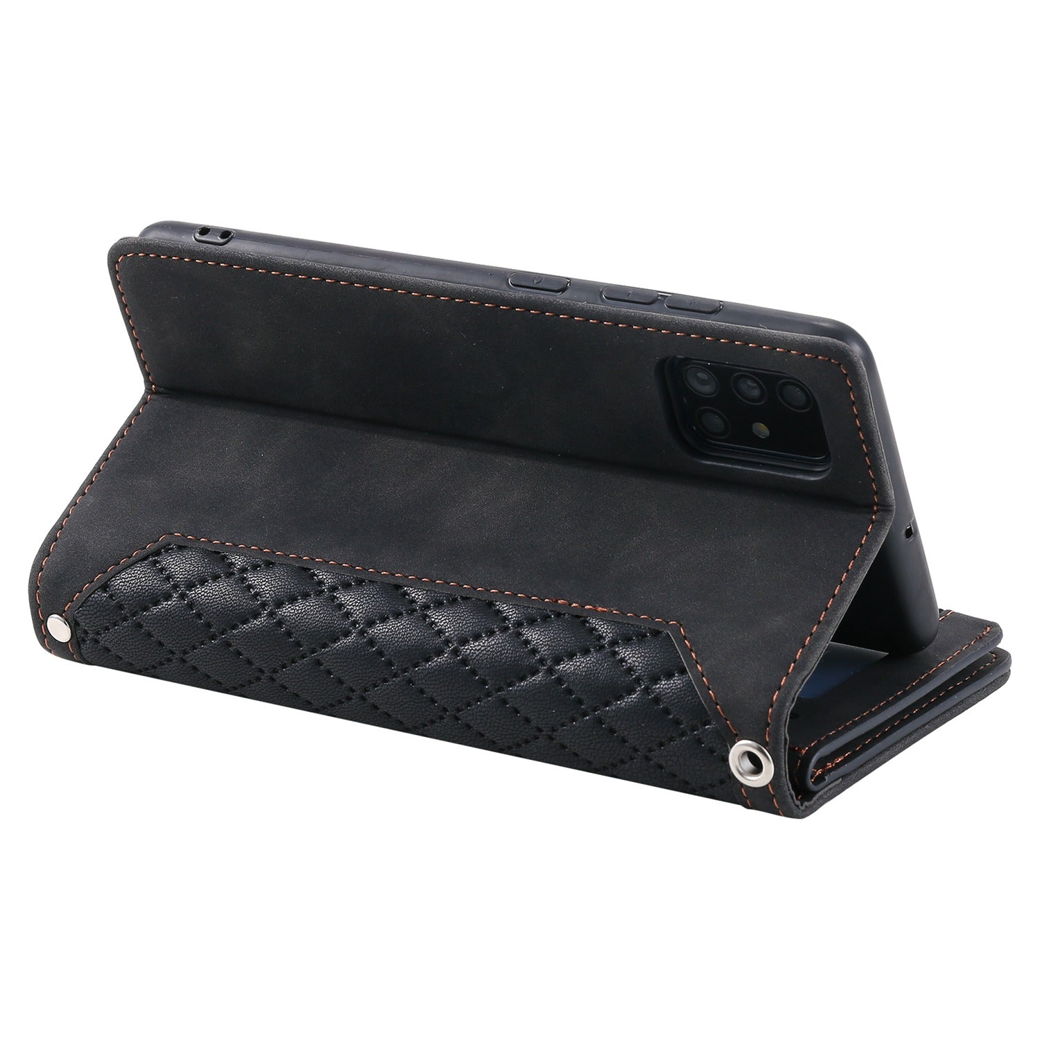 005 Style for Samsung Galaxy A51 4G SM-A515 Zipper Pocket Anti-scratch Phone Case Rhombus Texture PU Leather Stand Wallet Cover with Wrist Strap