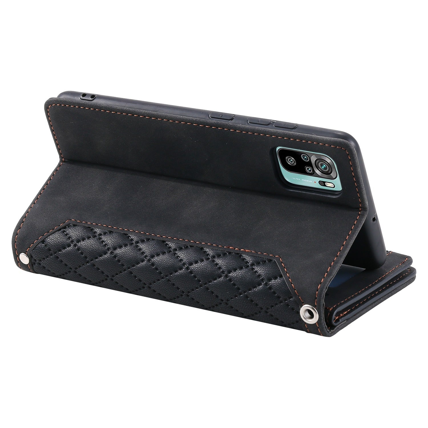 005 Style for Xiaomi Poco M5s 4G / Redmi Note 10 4G / Redmi Note 10S 4G Scratch Resistant Rhombus Texture Phone Case PU Leather Zipper Pocket Stand Wallet Cover with Wrist Strap