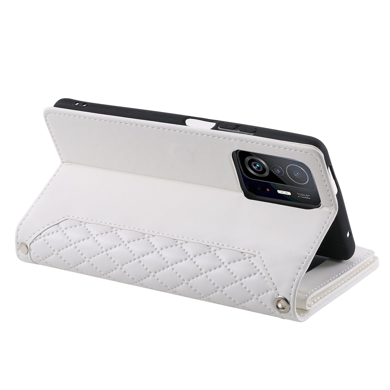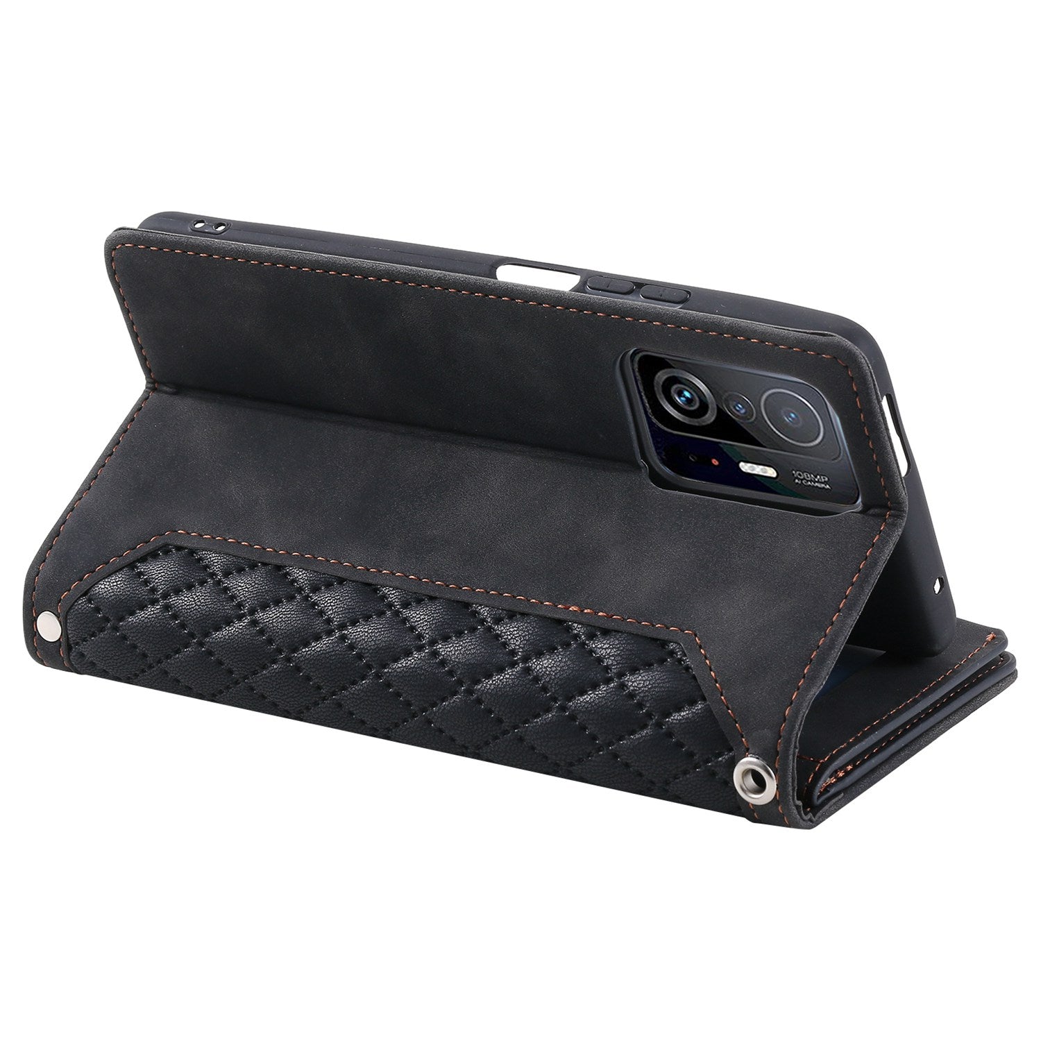 005 Style Protection Cover for Xiaomi 11T 5G / 11T Pro 5G, Supporting Stand Wallet Rhombus Texture PU Leather Zipper Pocket Design Phone Case with Strap