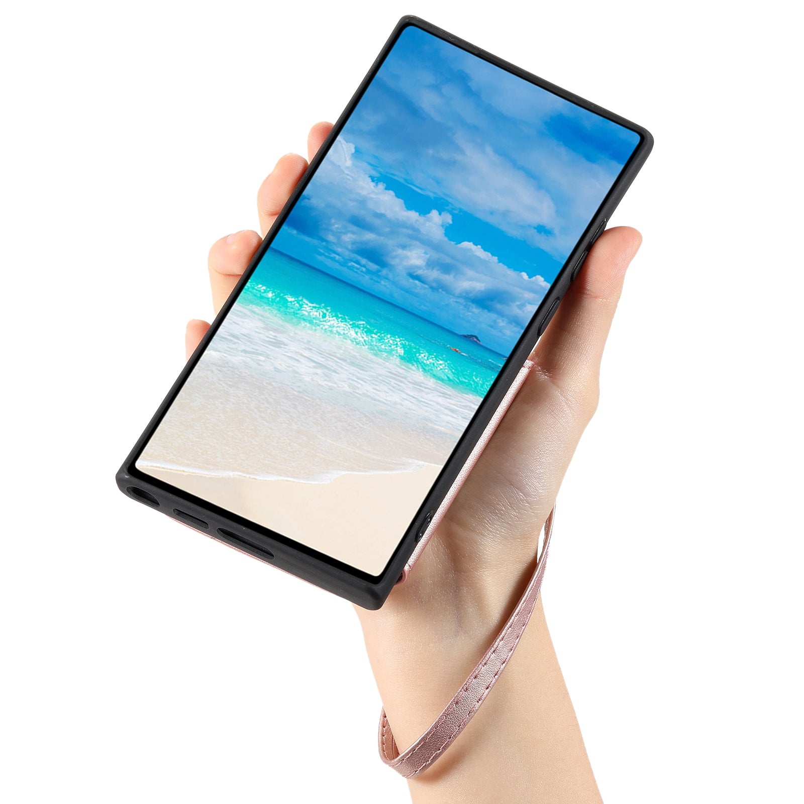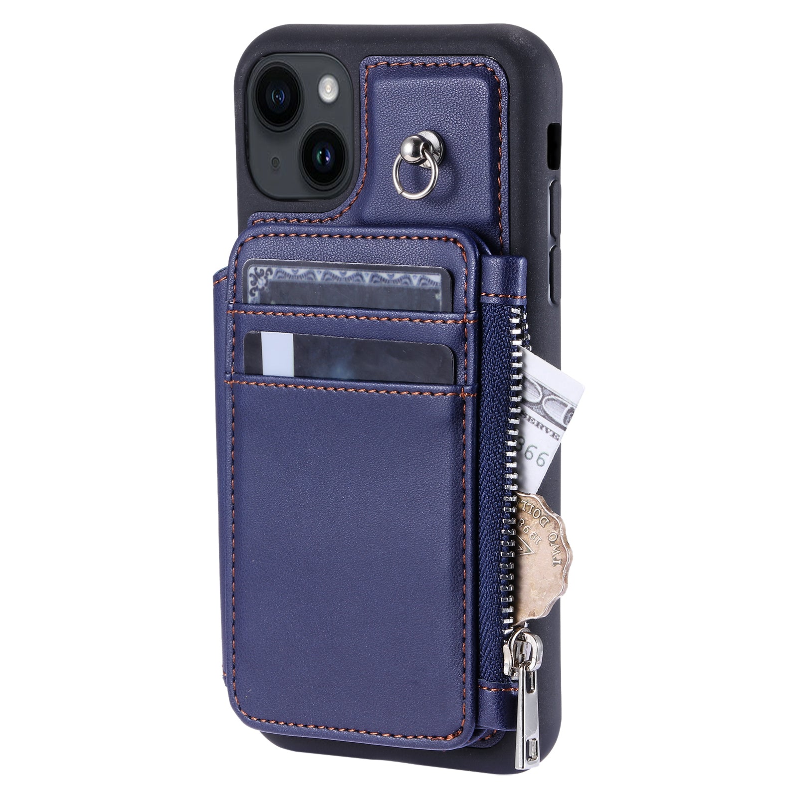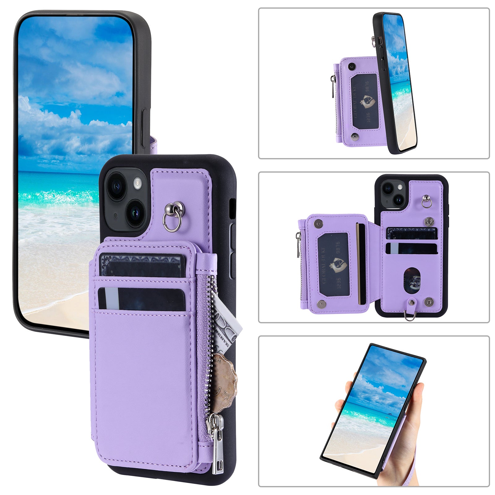 009 Anti-Scratch Phone Case for iPhone 15 , Wallet RFID Blocking PU+TPU Cover Kickstand Zipper Shell with Strap