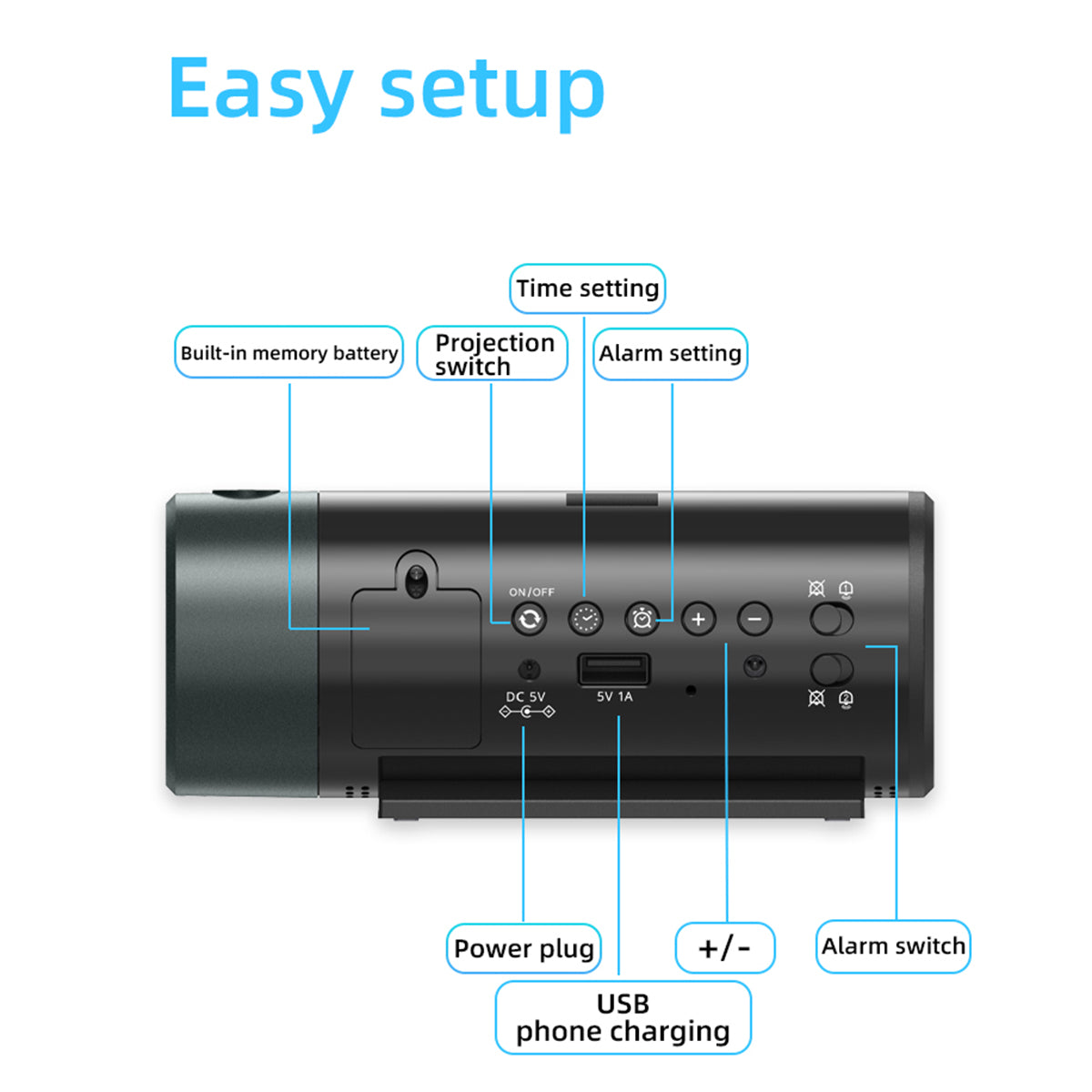 - LED screen for clear display of time and temperature, supports the simultaneous projection of time + temperature on the wall
