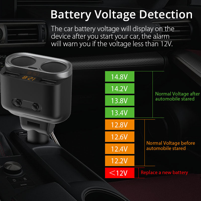 - Intelligent LED display for correct display of vehicle voltage or charging current. When the car voltage is below 12V, it will issue a warning with a flashing number