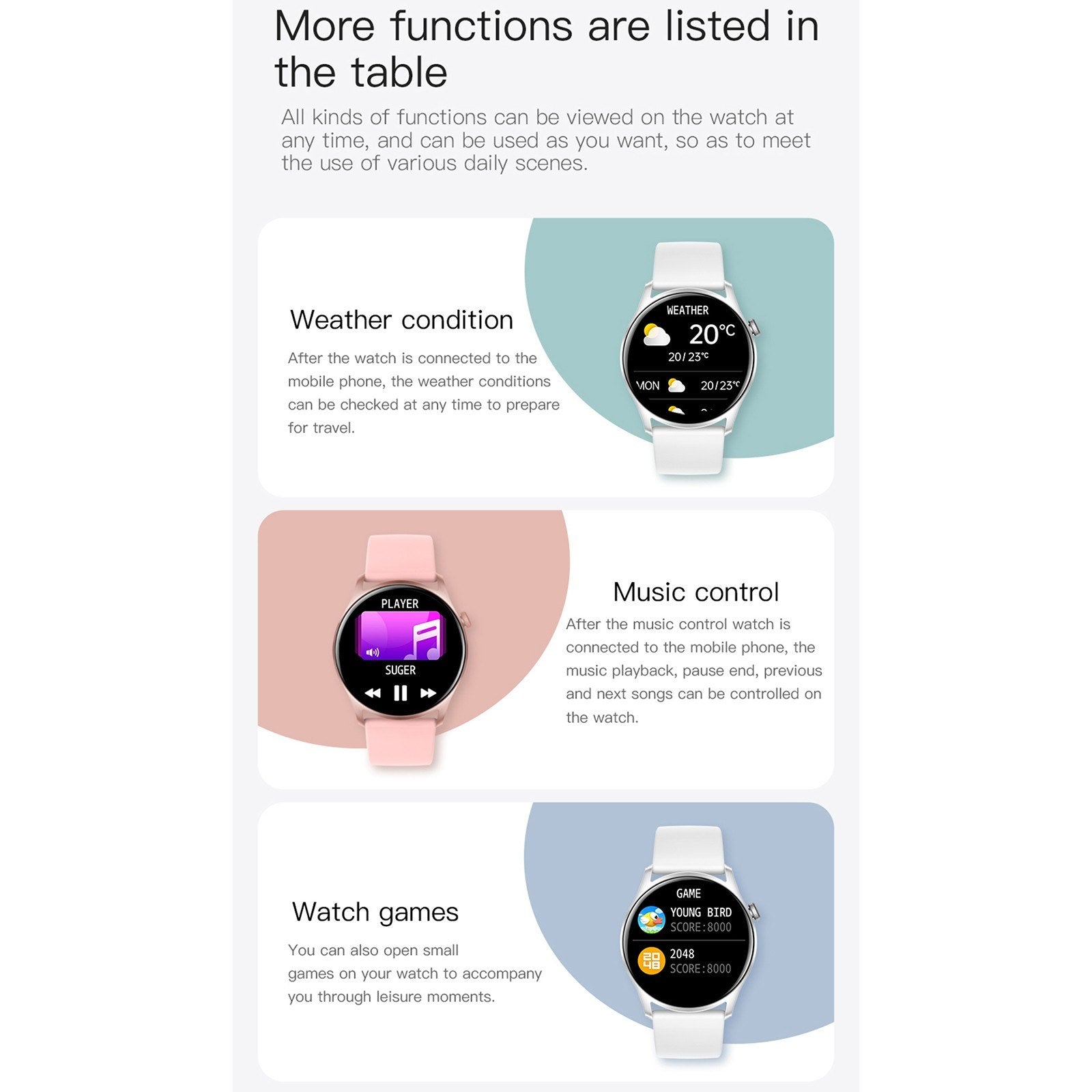 - More Functions Breath training, Weather, Music control, Remote camera, Game, Stopwatch, Alarm clock, Timer, Theater mode, DND mode, etc.
