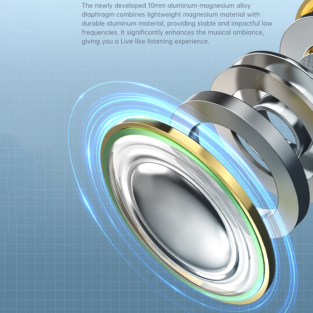 - The newly developed 10mm aluminum-magnesium alloy diaphragm combines lightweight magnesium material with durable aluminum material, providing stable and impactful low frequencies.It significantly enhances the musical ambiance, giving you a Live-like listening experience