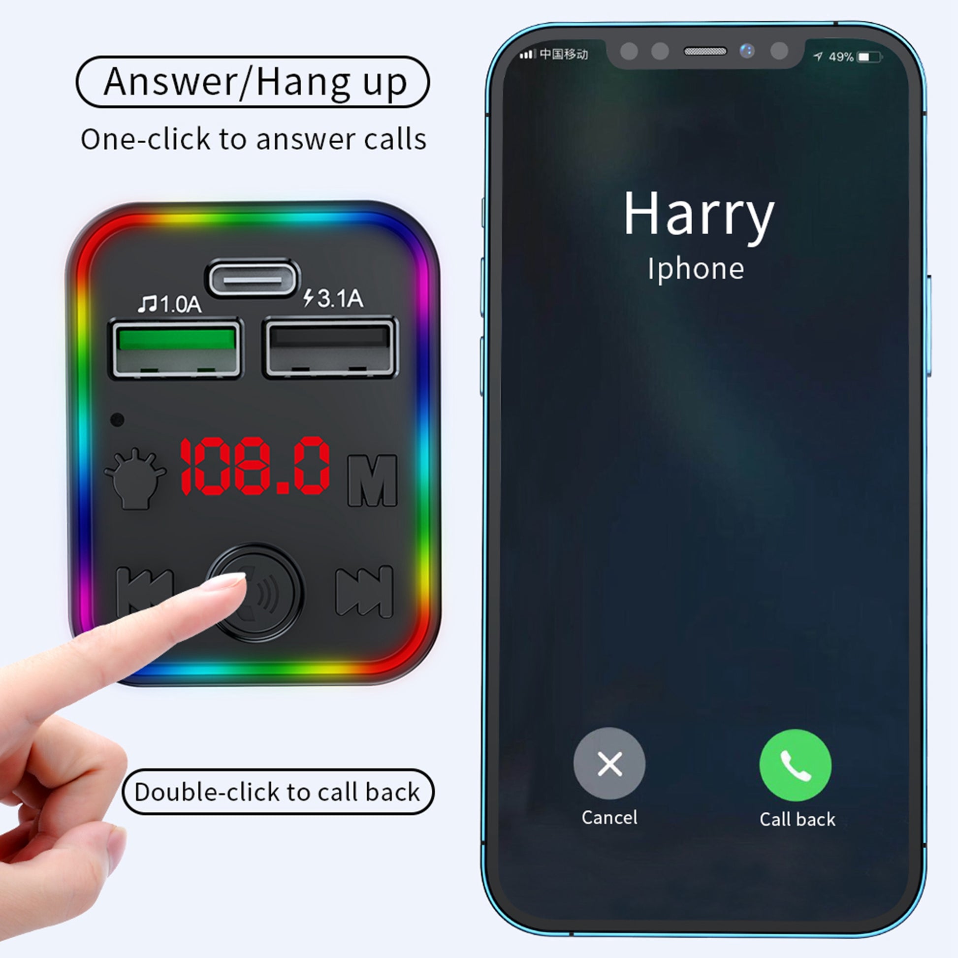 - Clear Hands-free Phone Calling: It is a built-in Mic with high-quality sound technology that offers you clear talking. With just one click when receiving a call, the Wireless FM transmitter will provide you with a hands-free function and a safer driving experience