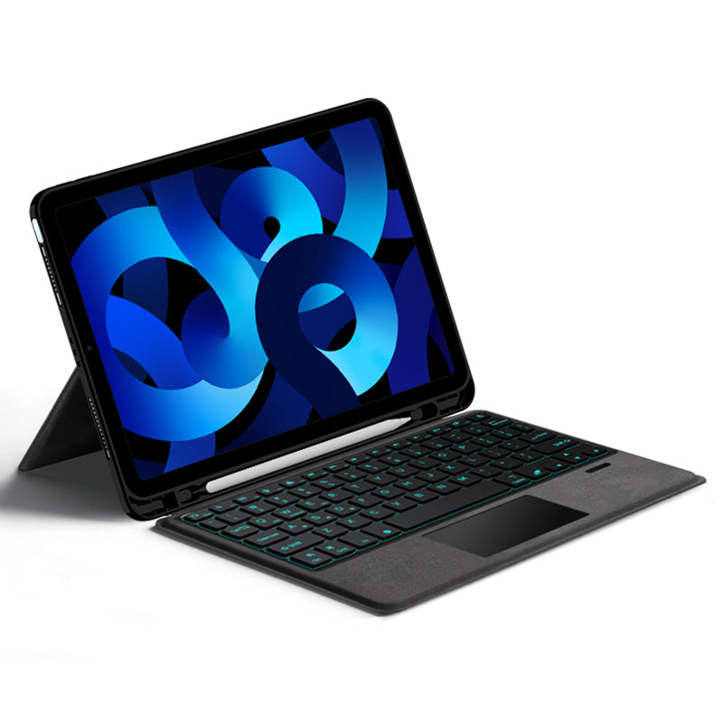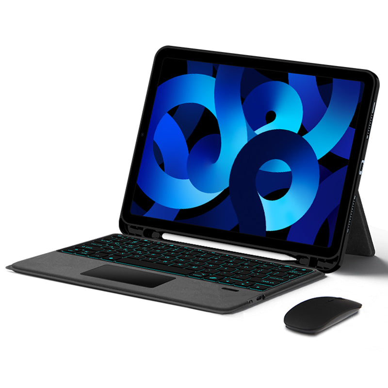 For iPad Air (2020) / (2022) Tablet Case Genuine Cow Leather Folio Stand Cover with Integrated Backlight Wireless Keyboard