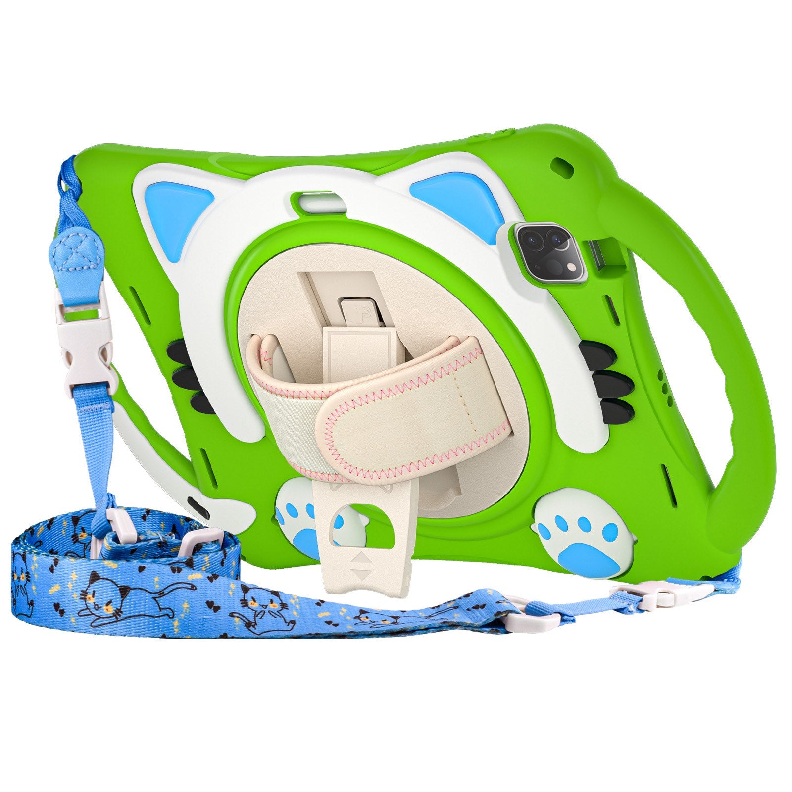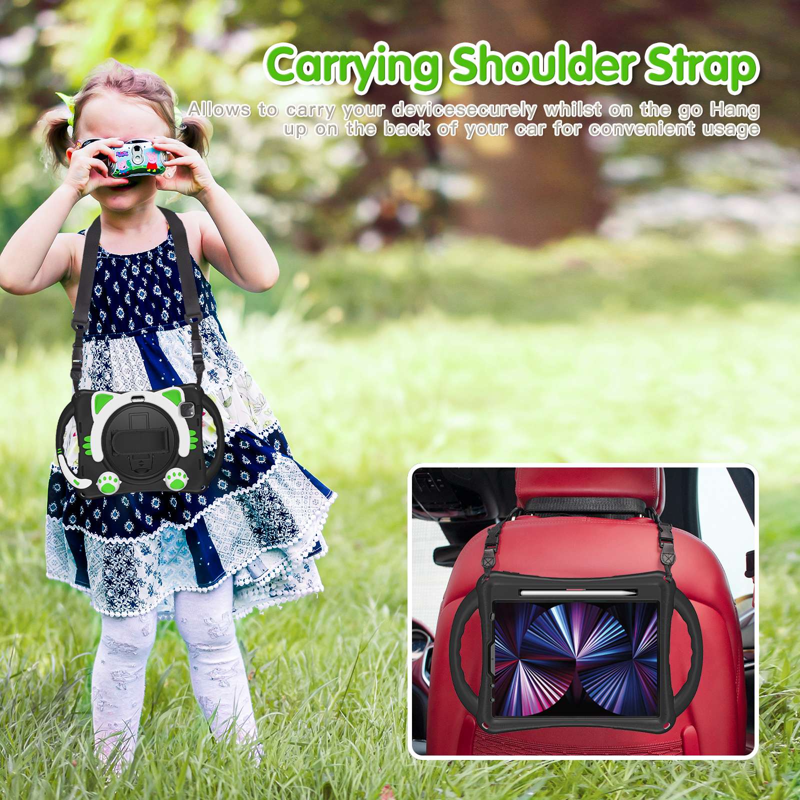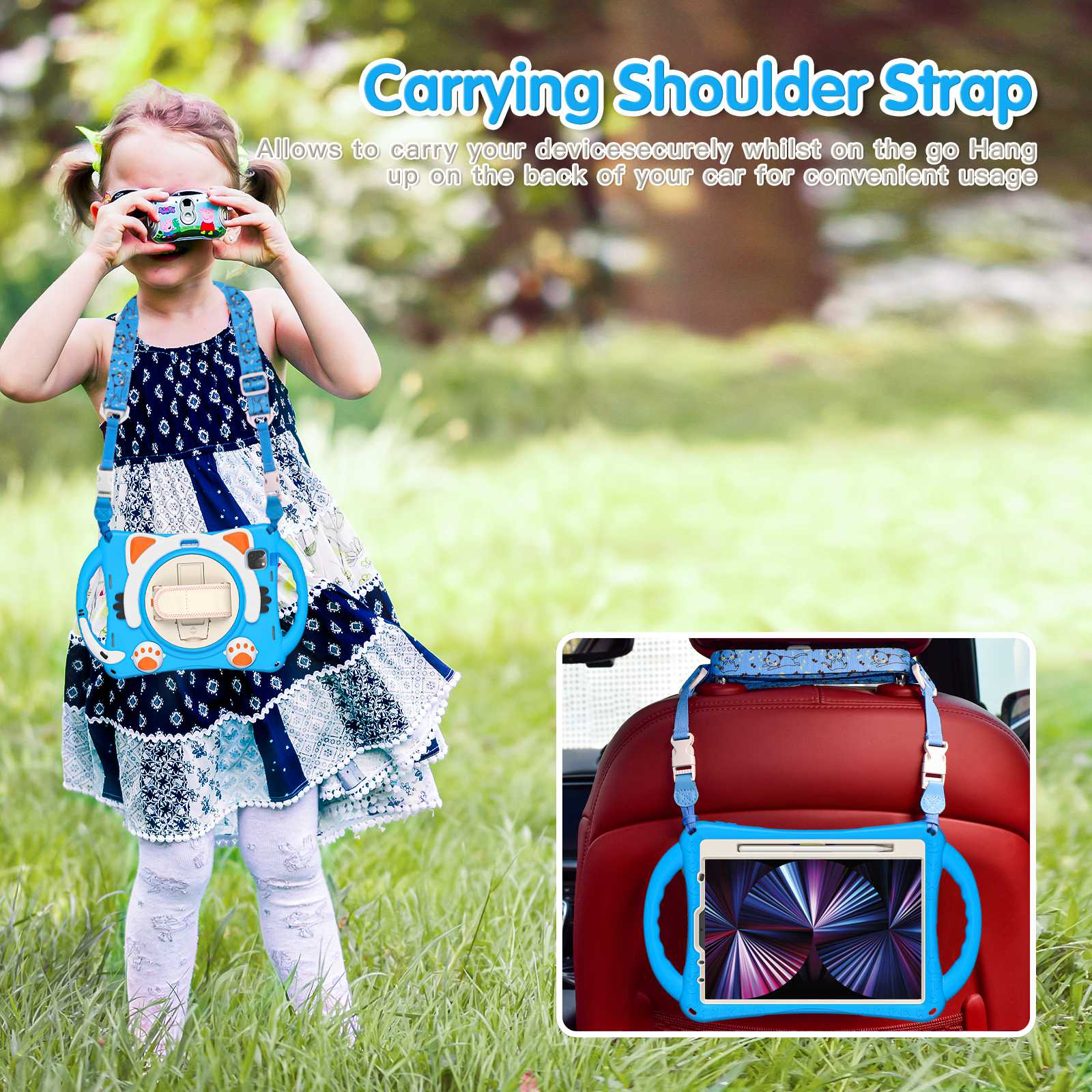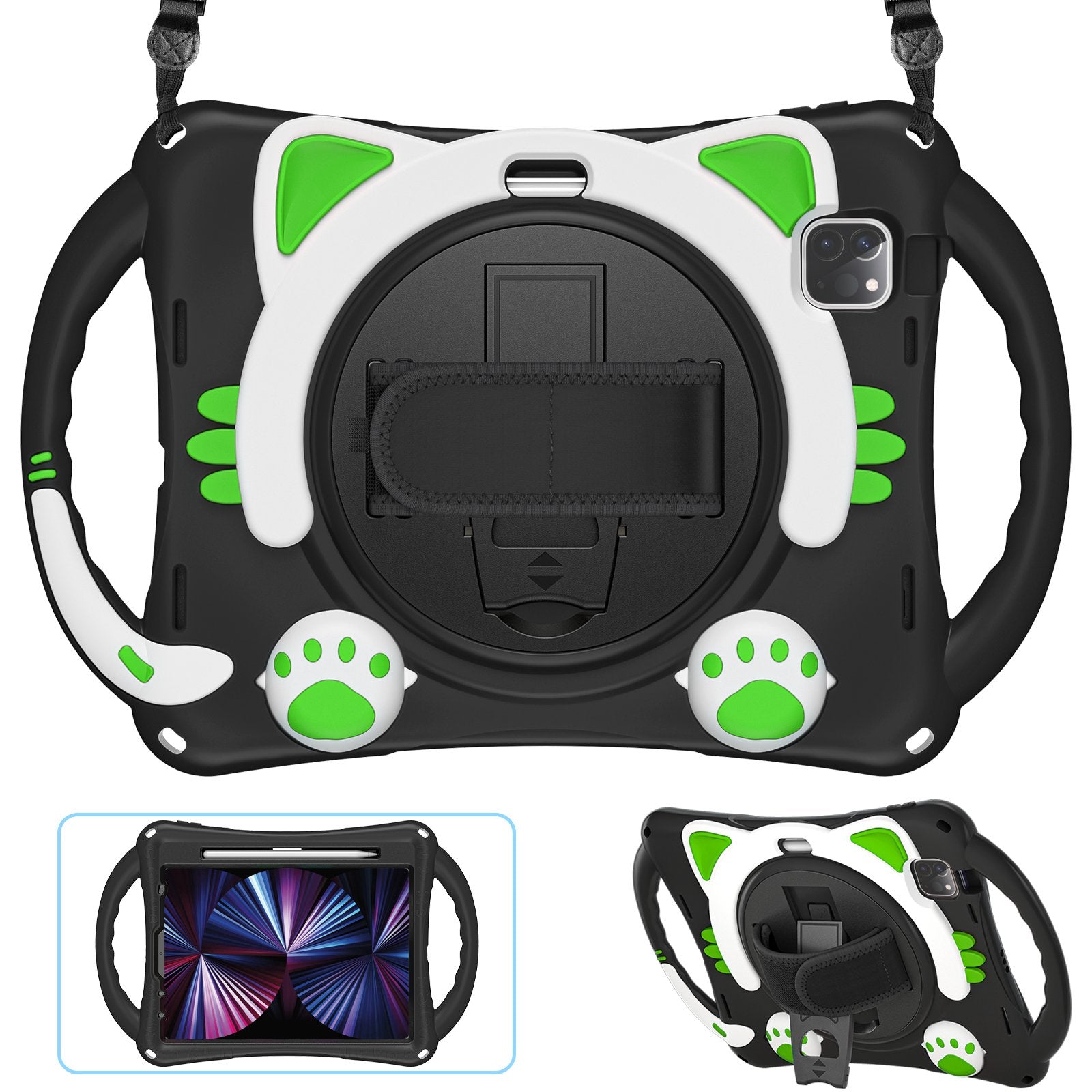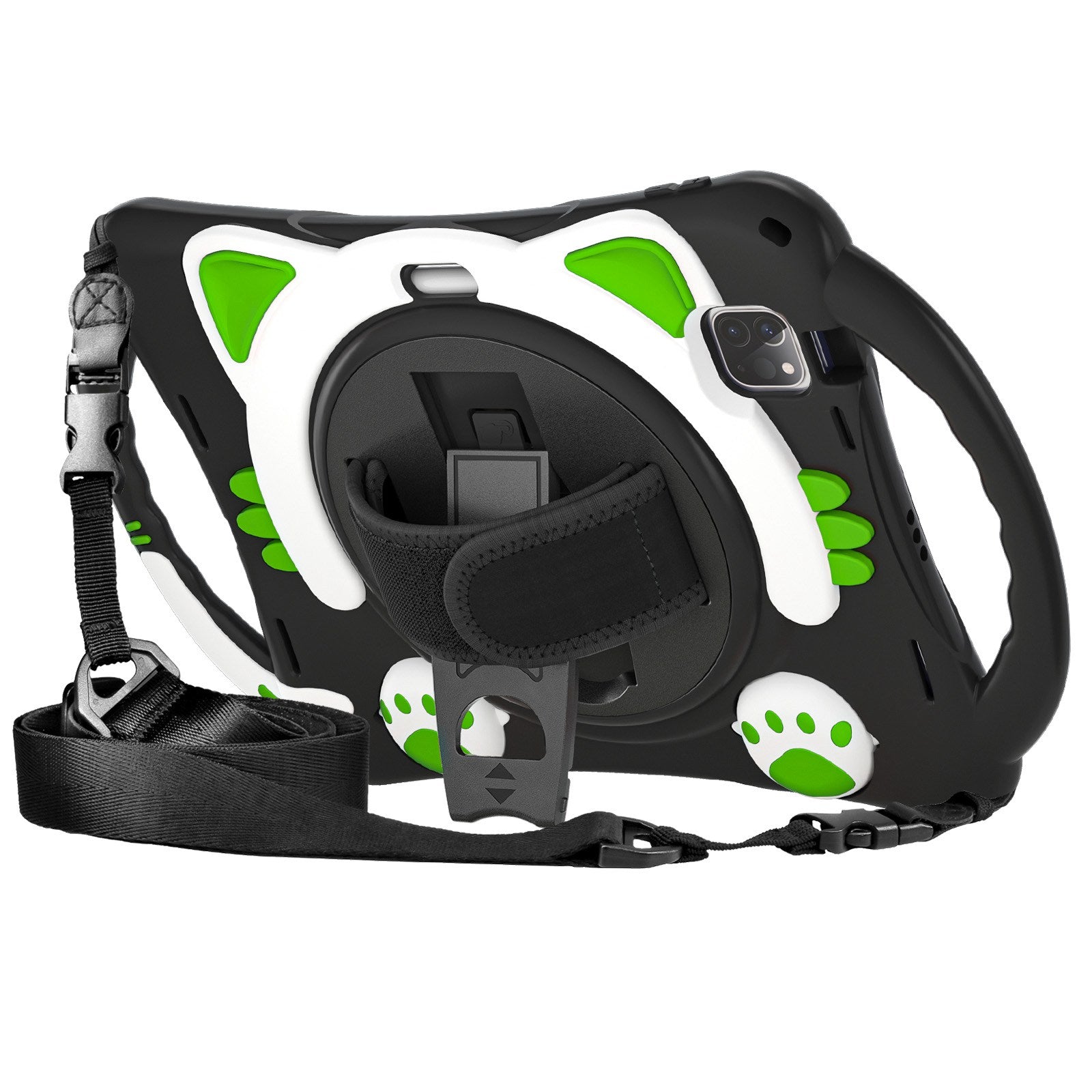 For iPad Air (2022)/(2020)/iPad Pro 11-inch (2021)/(2020)/(2018) Hand Strap Holder Protective Case PC + Silicone Kickstand Cover with Shoulder Strap and Pencil Holder