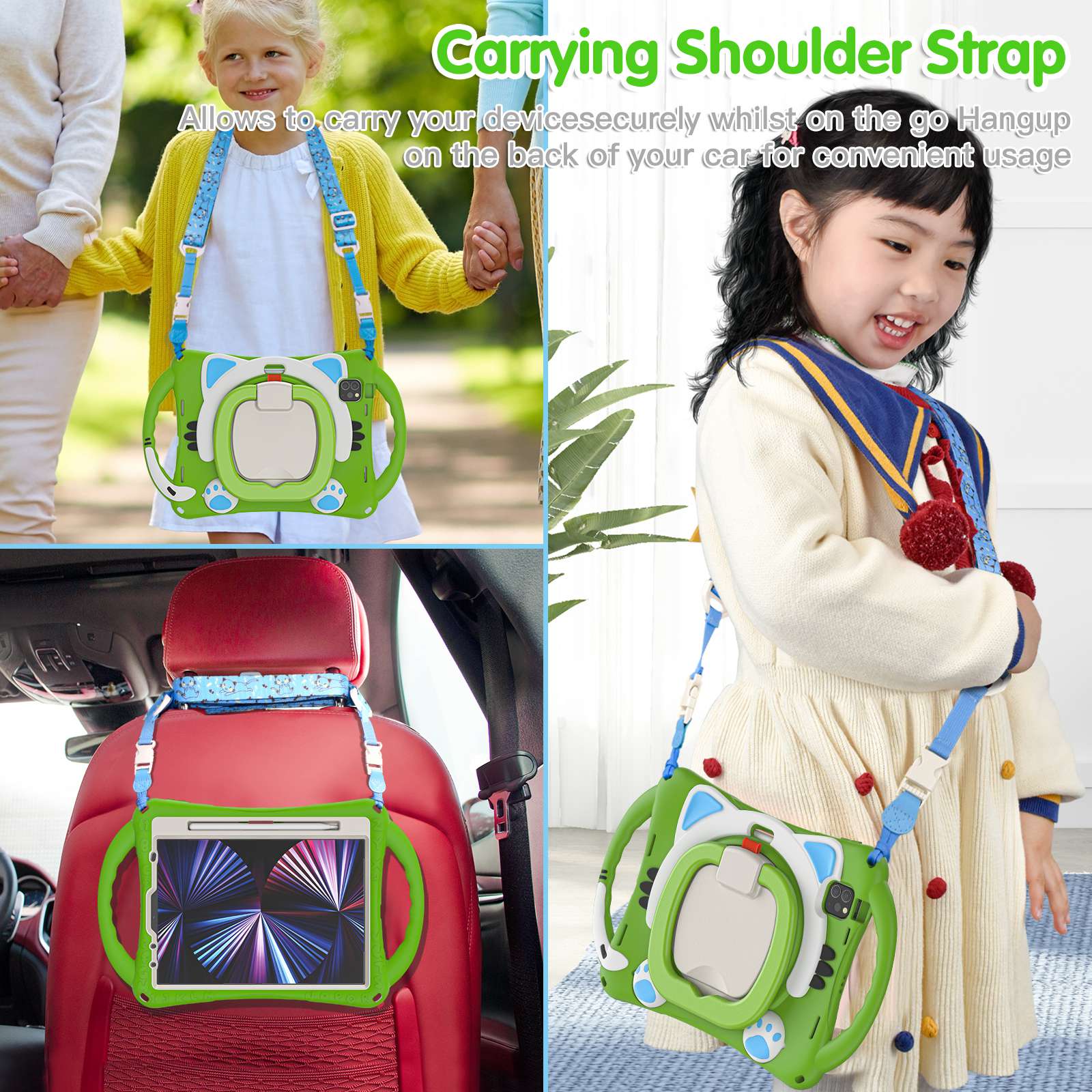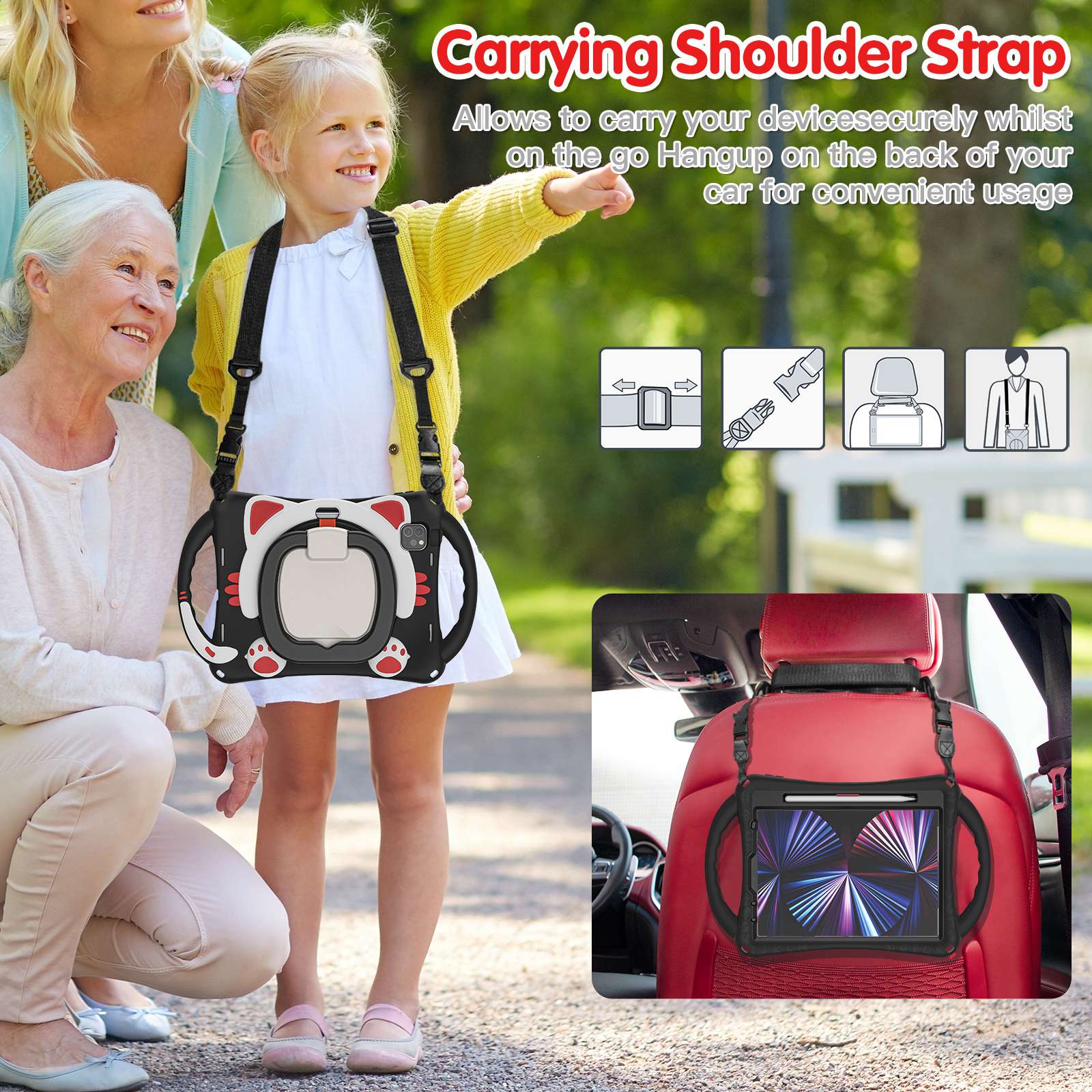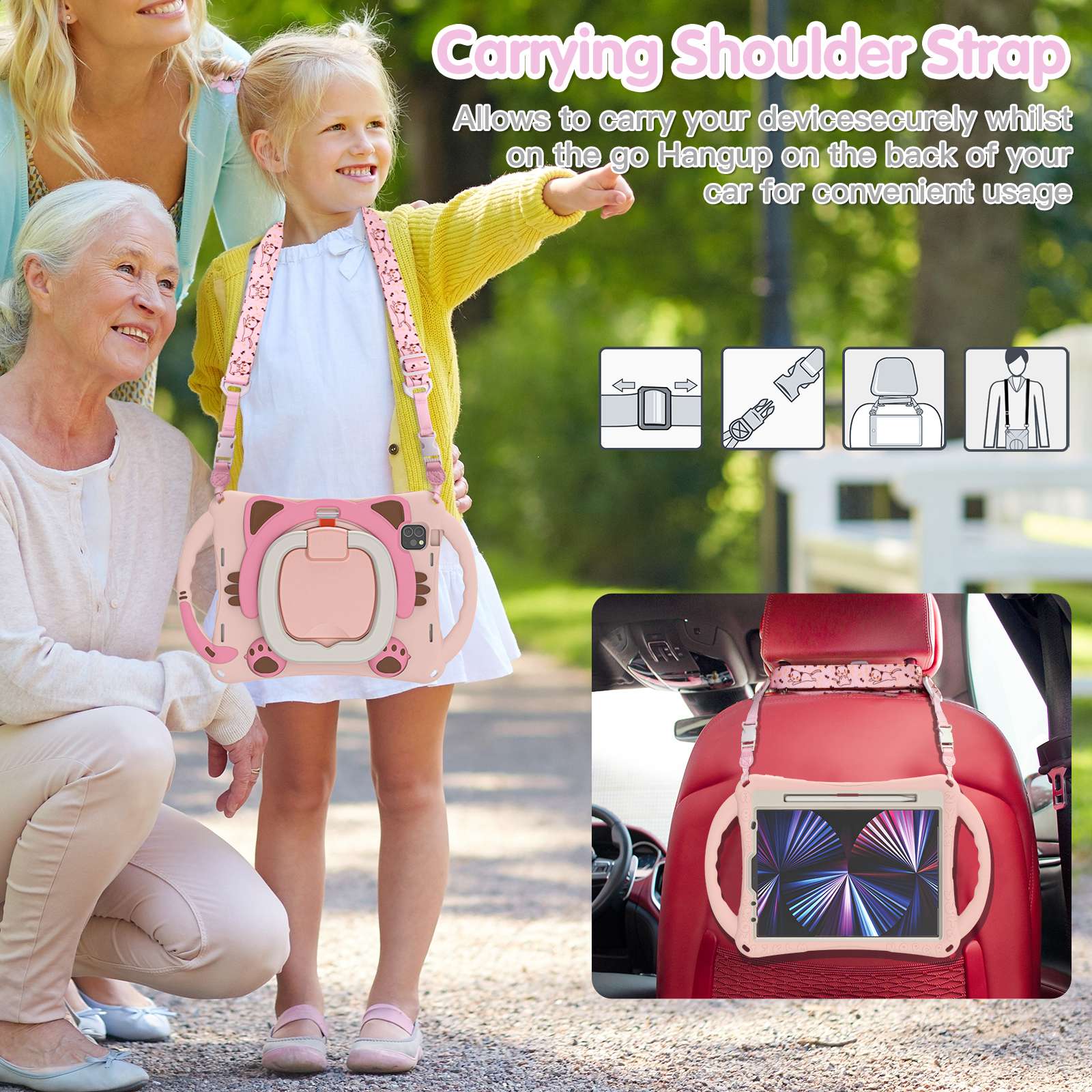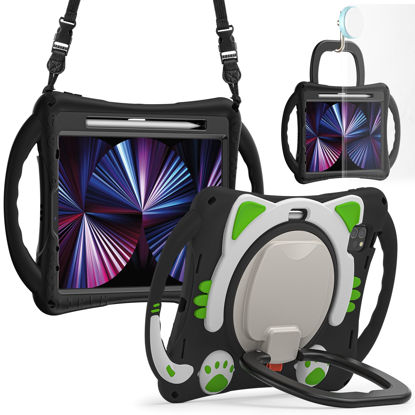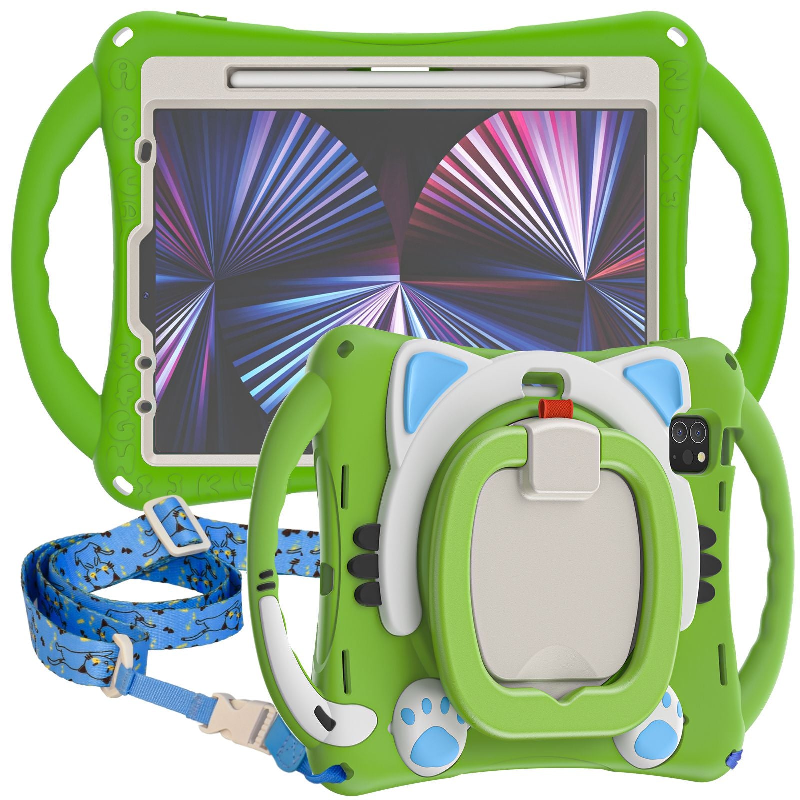 For iPad Air (2022)/(2020)/iPad Pro 11-inch (2021)/(2020)/(2018) Rotating Kickstand Design PC + Silicone Case Handle Grip Shockproof Cover with Shoulder Strap and Pencil Holder