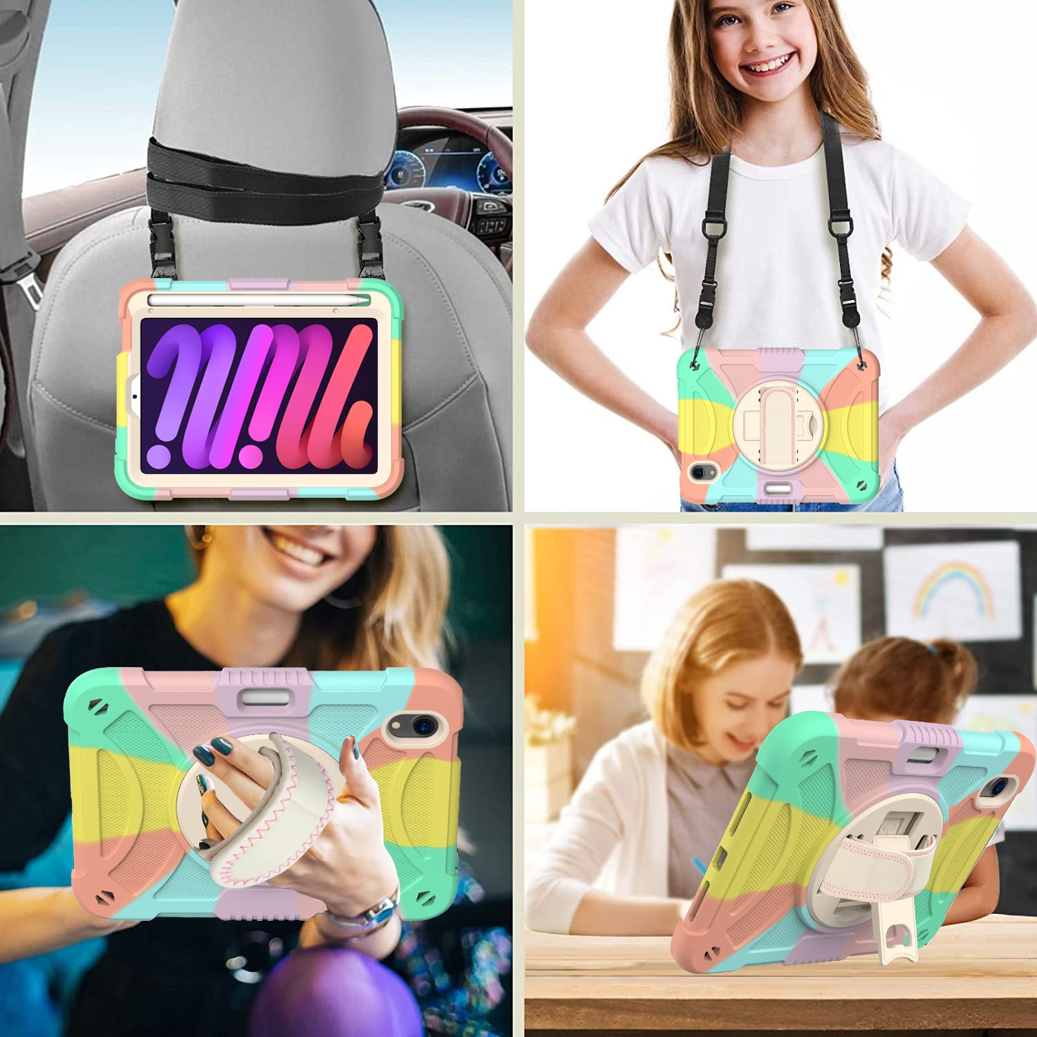 For iPad mini (2021) Tablet Case Silicone+PC Rotating Kickstand Cover with Pencil Holder / Shoulder Strap