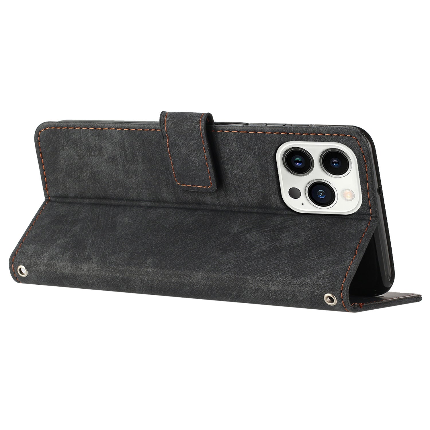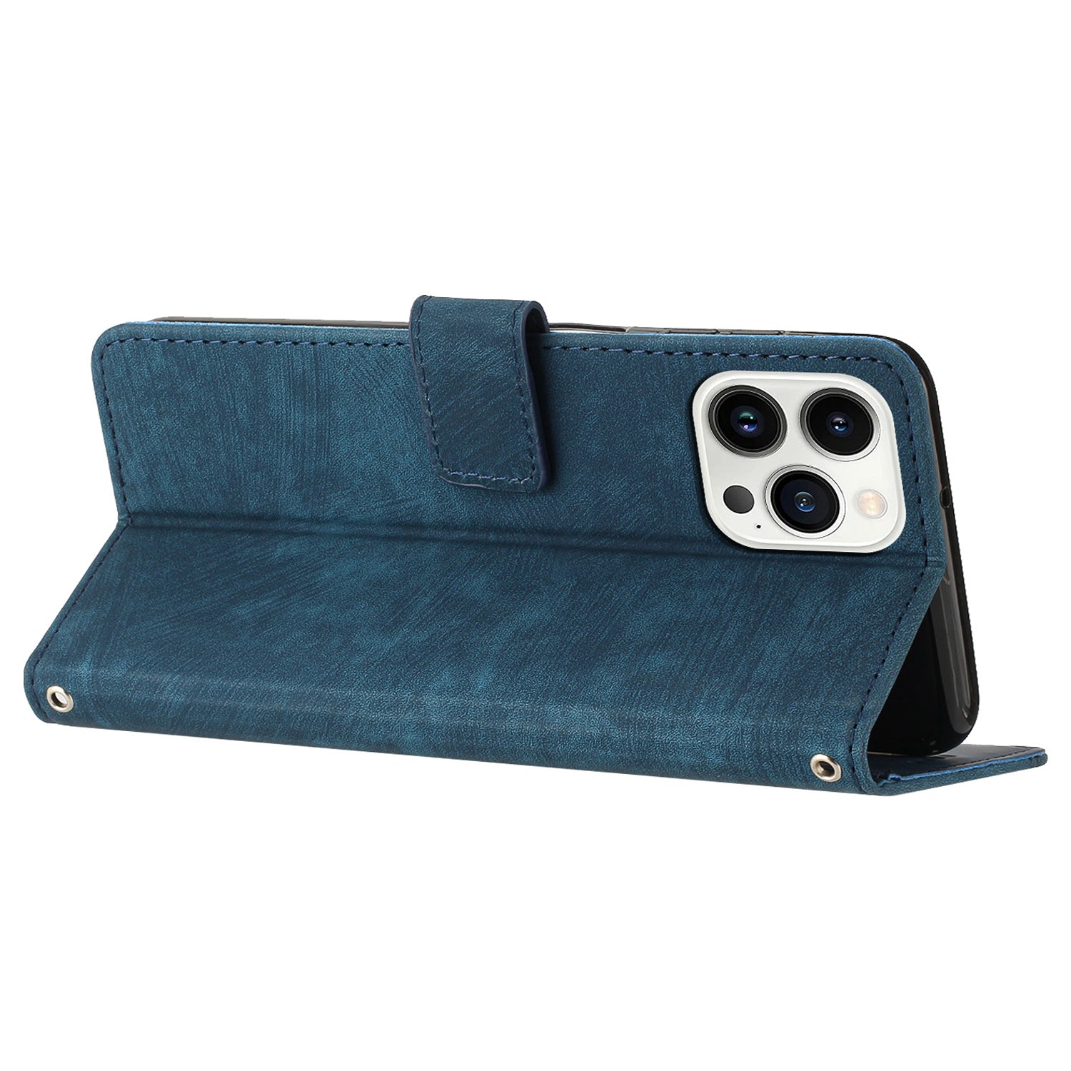 For iPhone 13 Pro Max 6.7 inch PU Leather Wallet Case Lines Imprinted Stand Phone Cover with Long Strap
