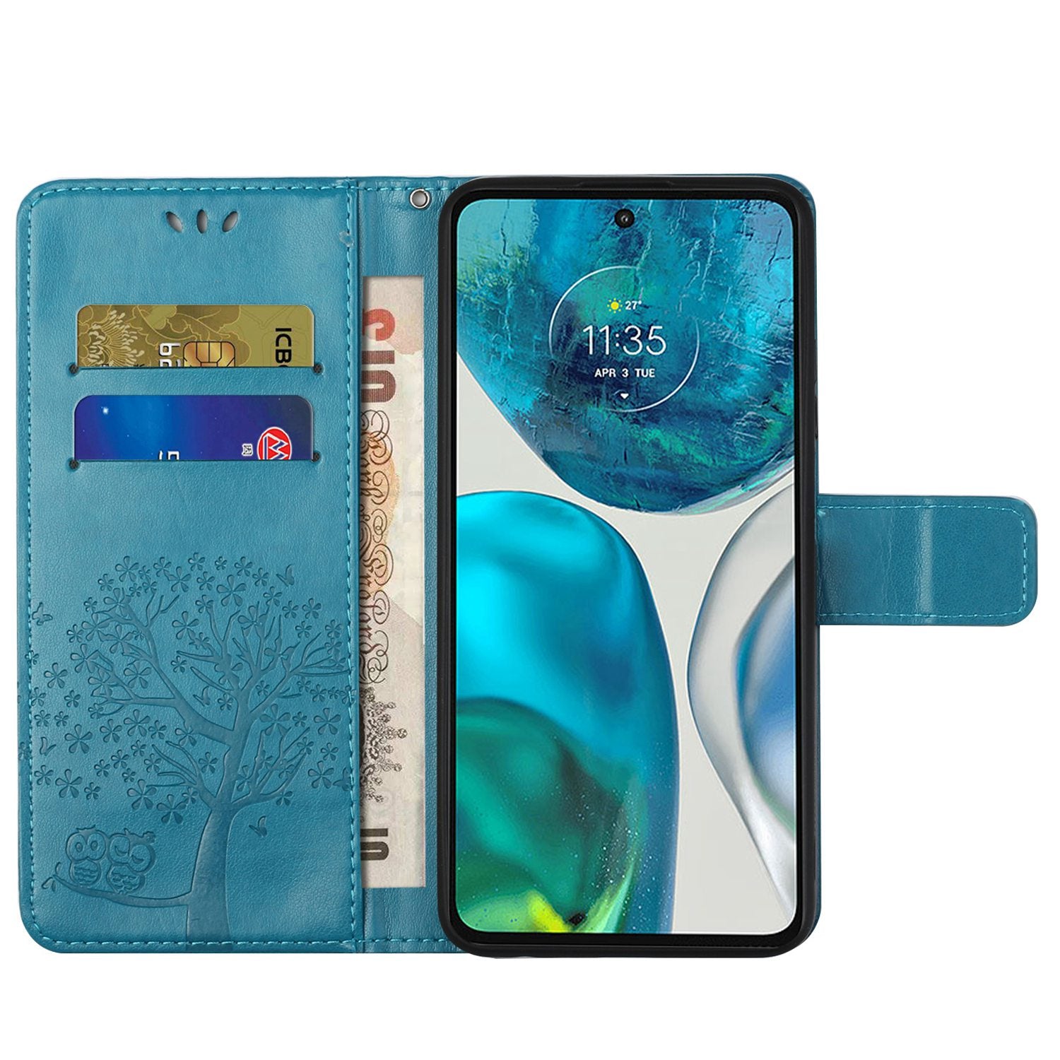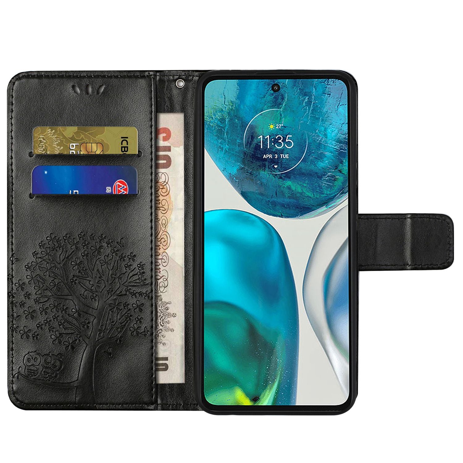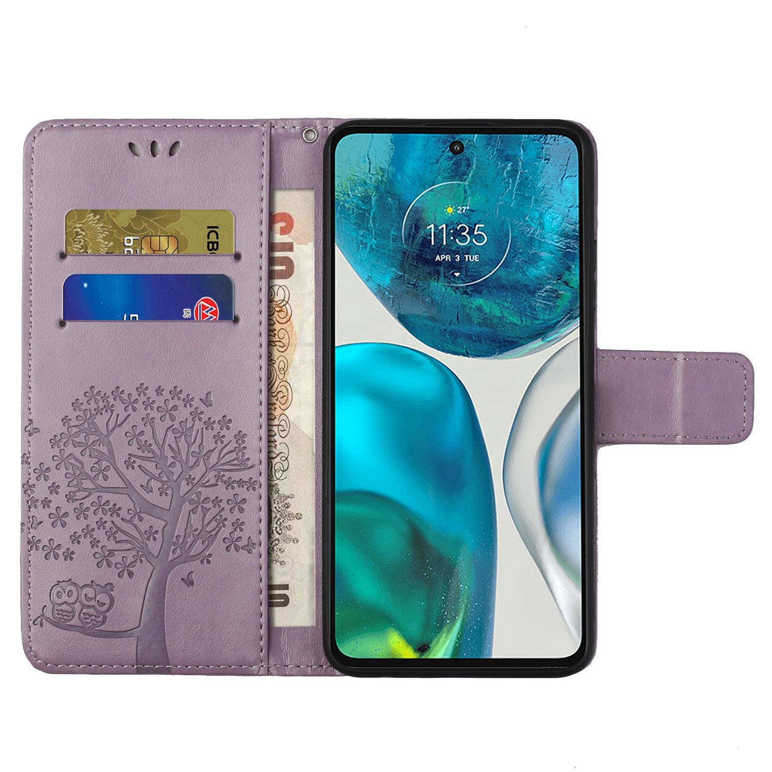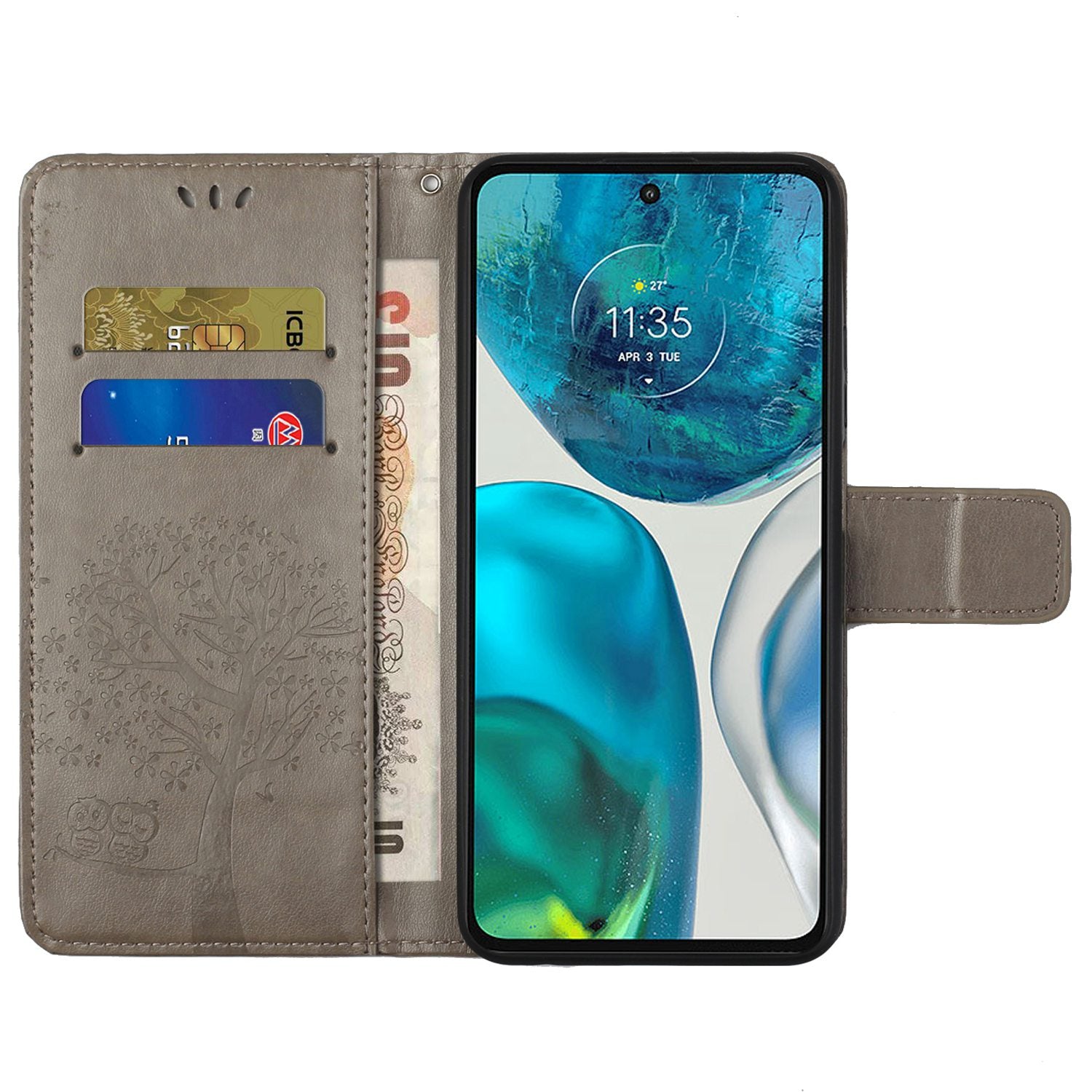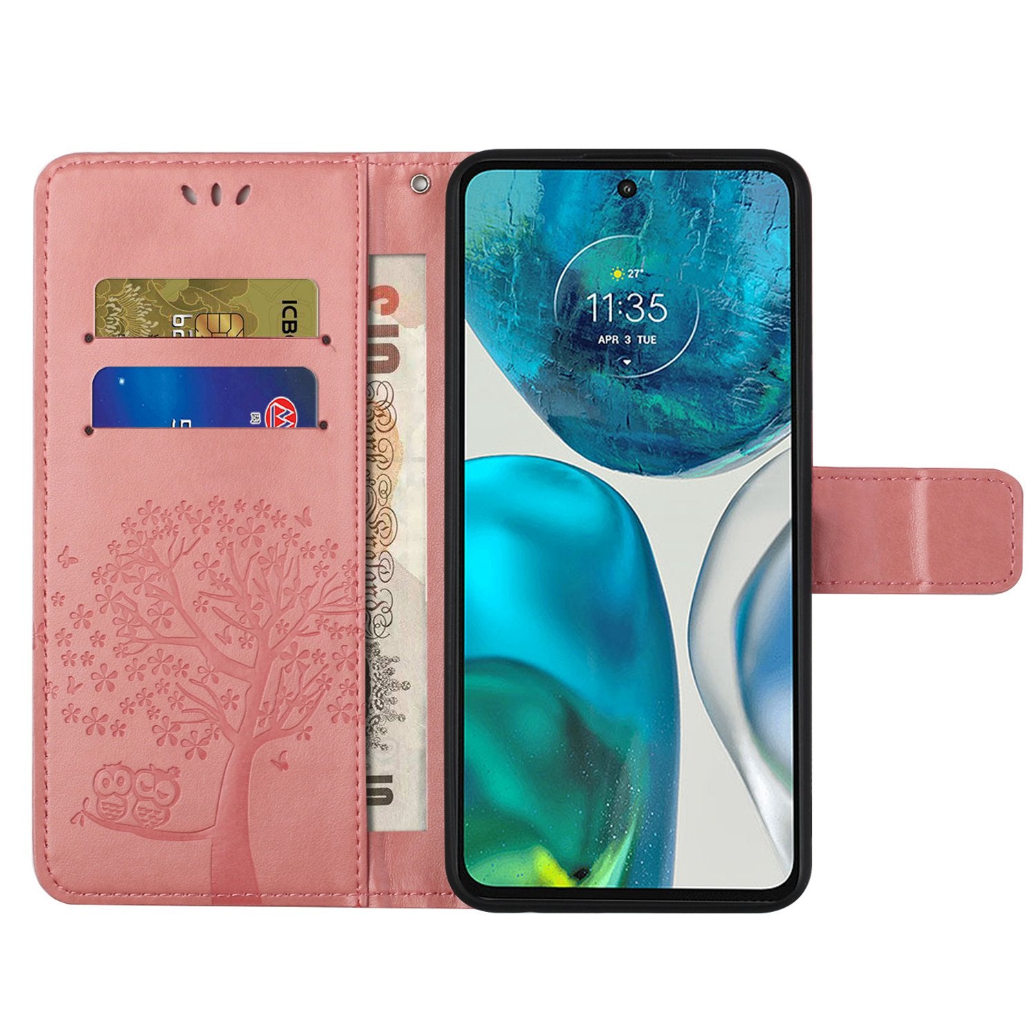 For Motorola Moto G52 4G Anti-scratch Anti-drop PU Leather Phone Cover Owl Tree Pattern Imprinted Wallet Style Stand Case with Wrist Strap