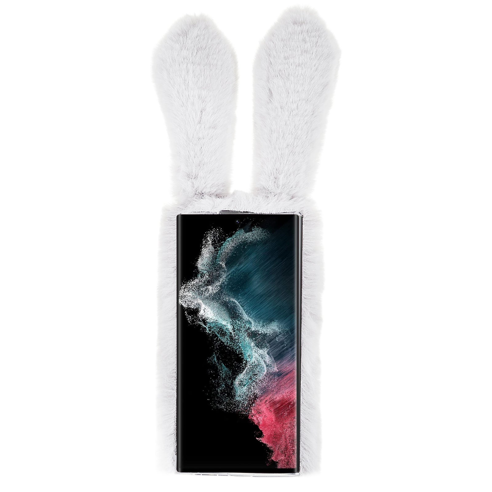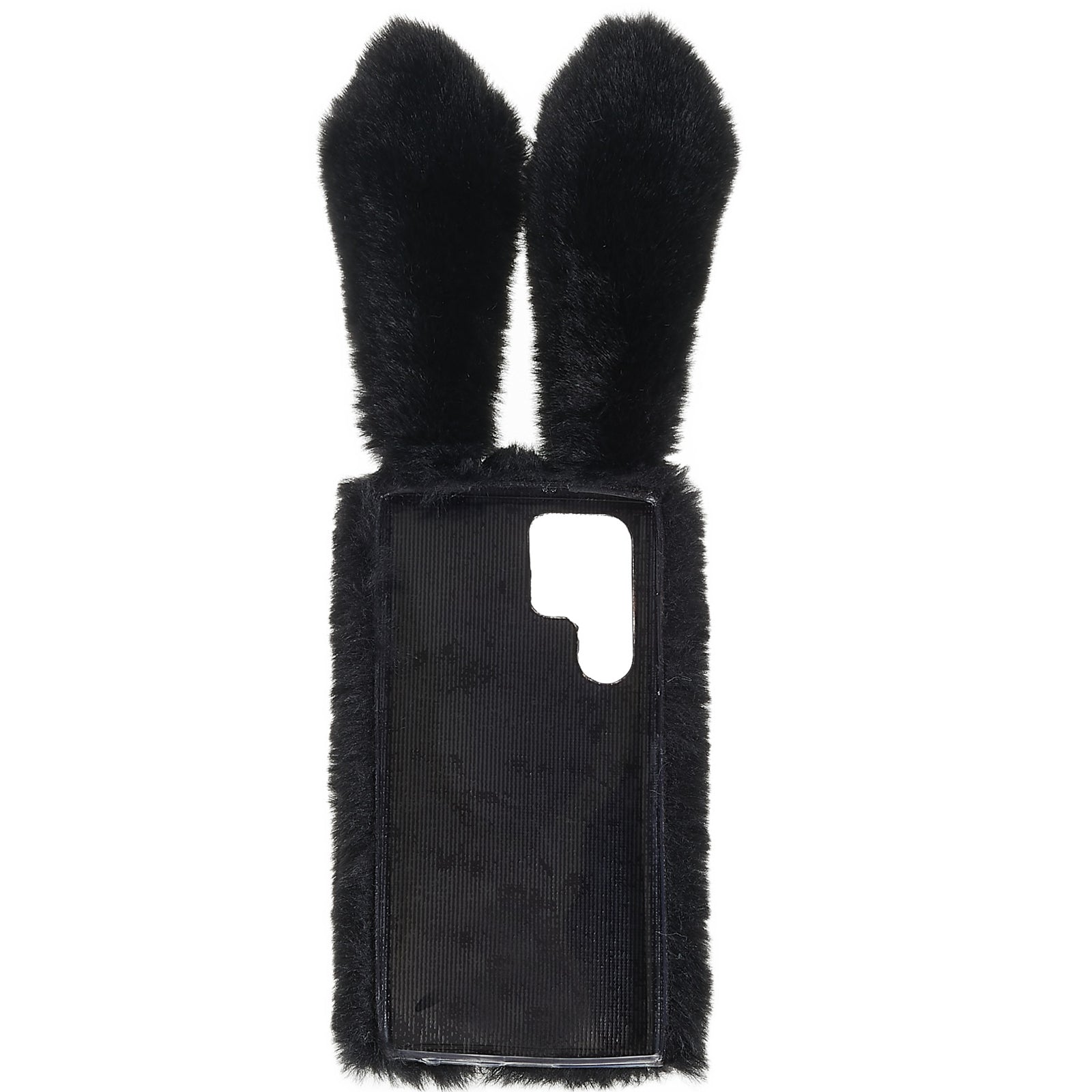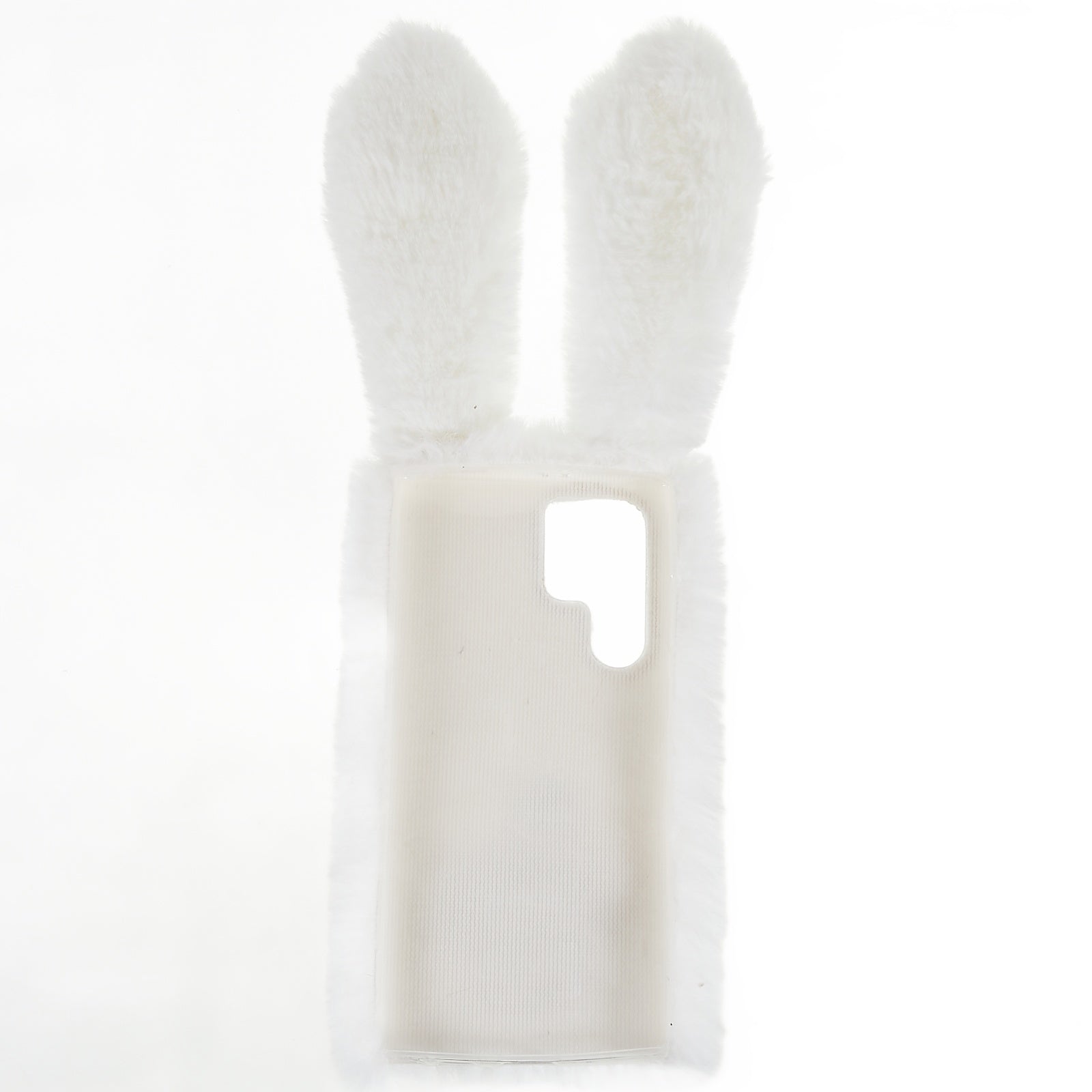 For Samsung Galaxy S22 Ultra 5G Cute 3D Bunny Ears Furry Winter Warm Case Soft TPU Protective Phone Cover with Glitter Rhinestone Bowknot