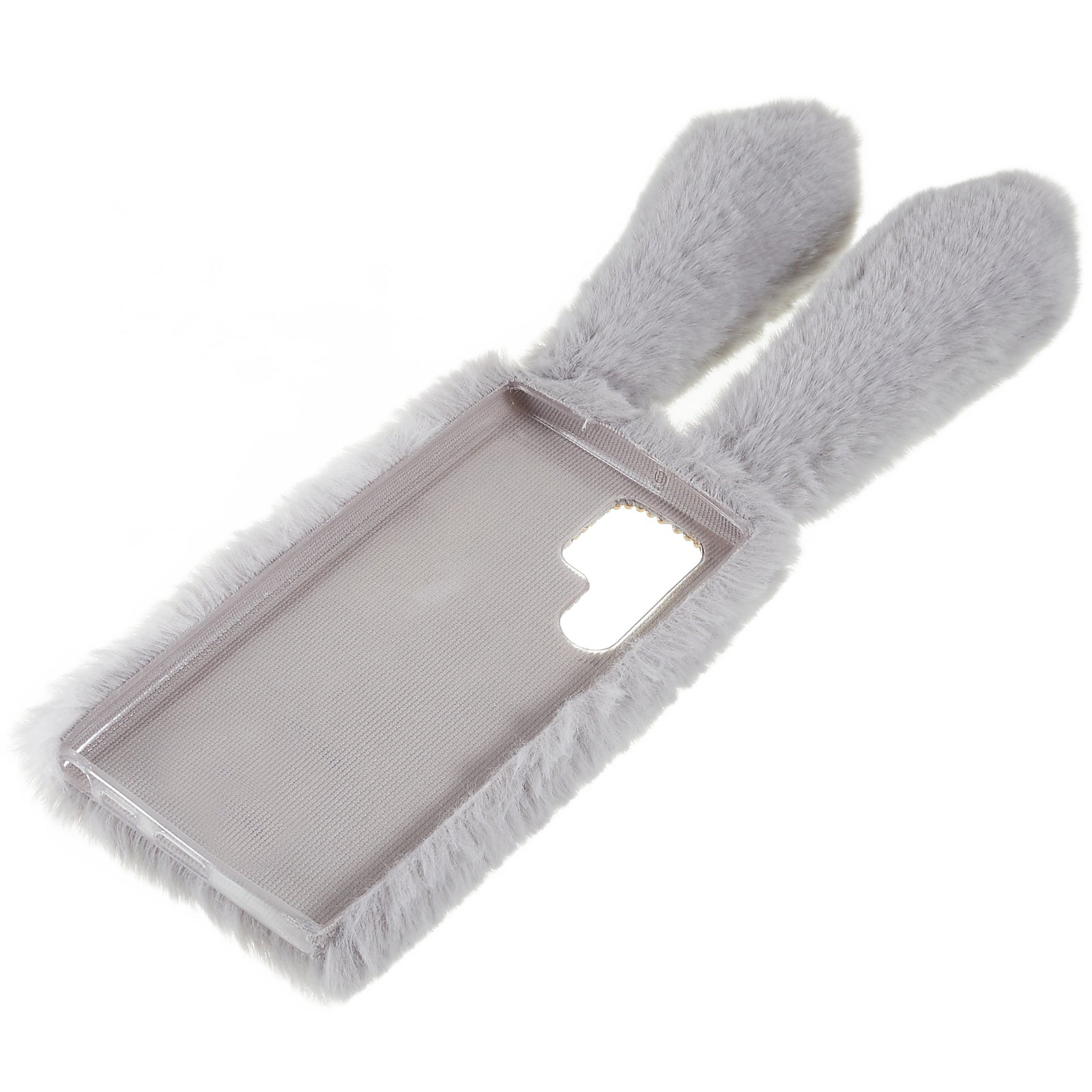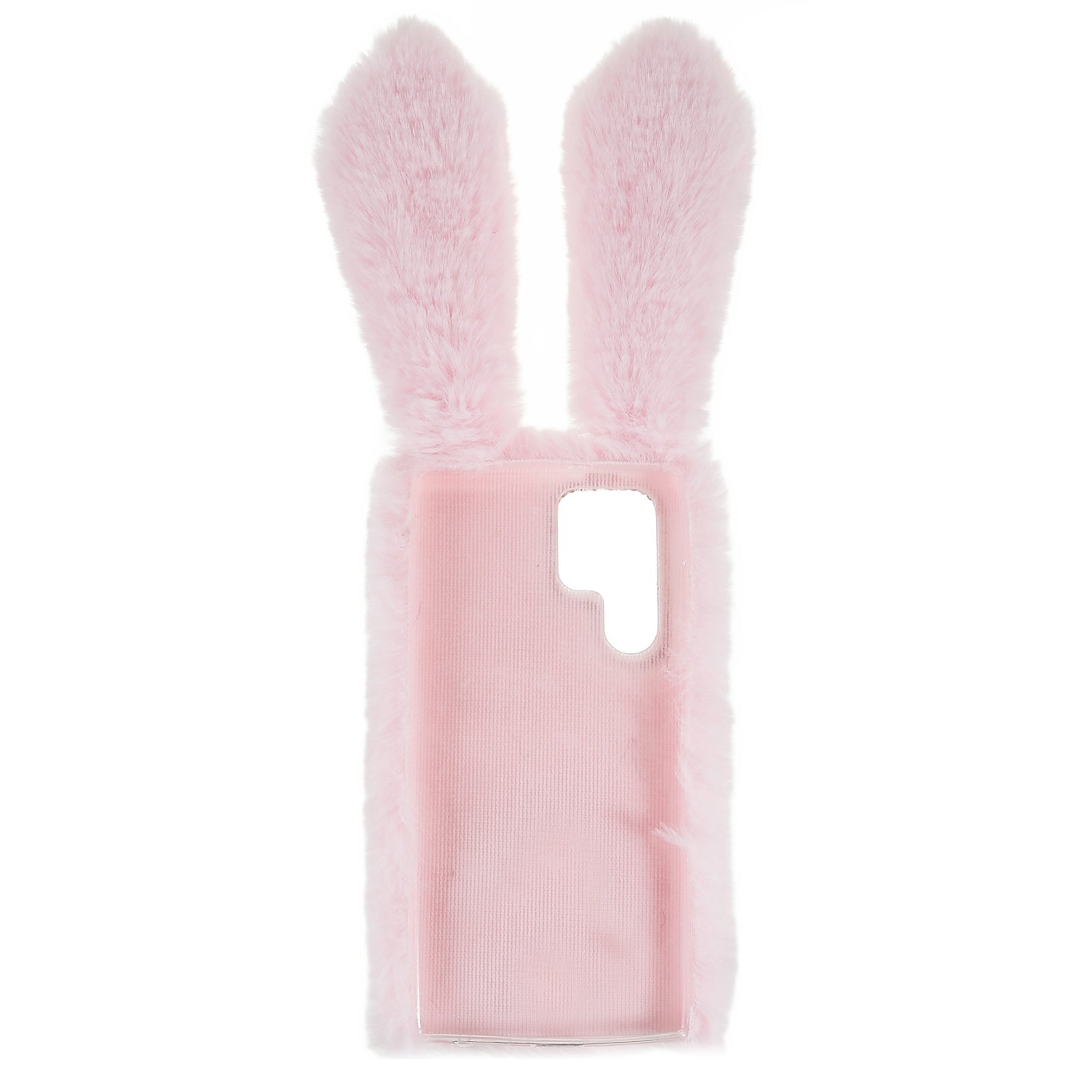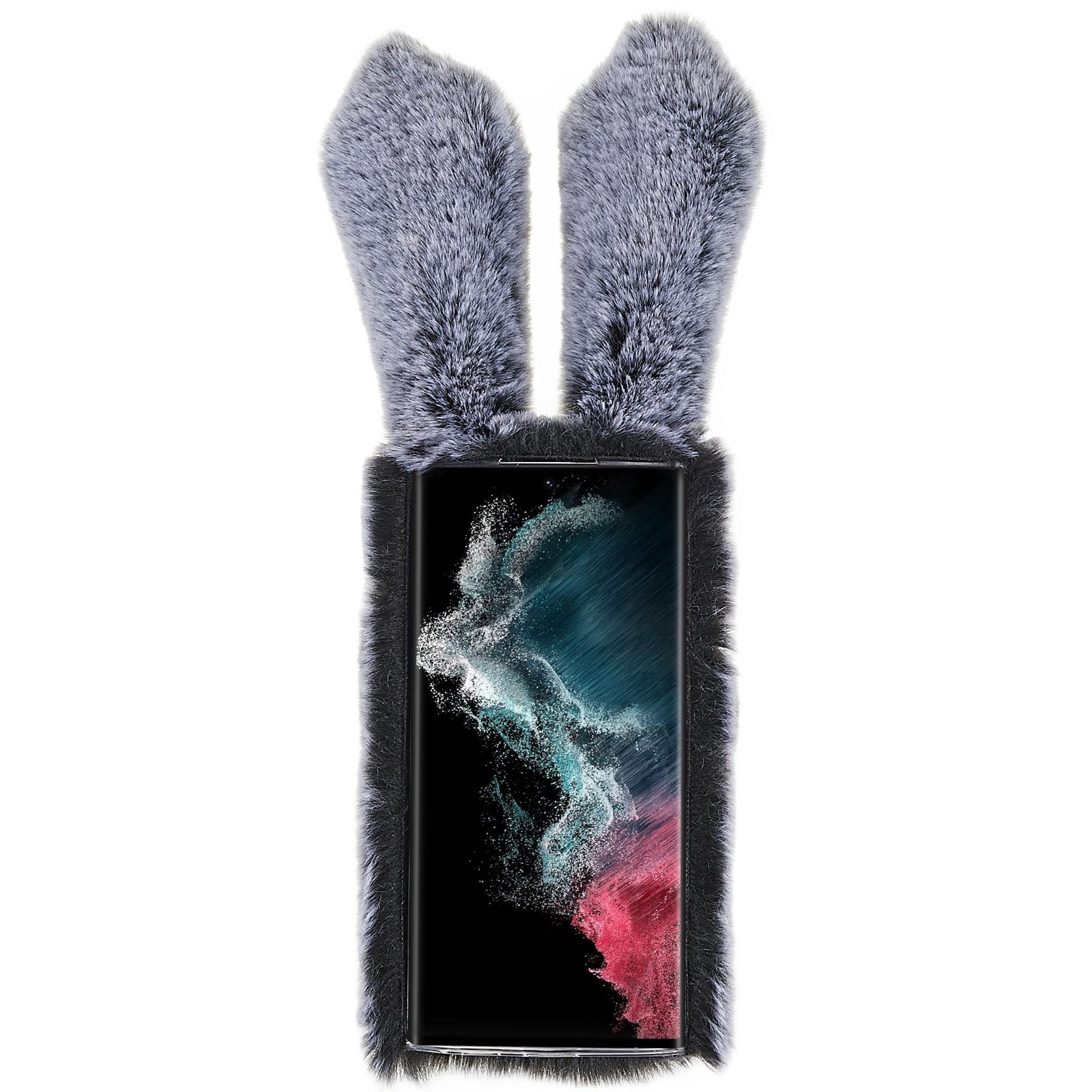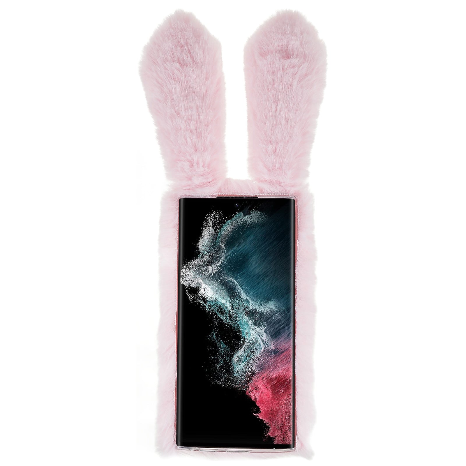 For Samsung Galaxy S22 Ultra 5G Cute 3D Bunny Ears Furry Winter Warm Case Soft TPU Protective Phone Cover with Glitter Rhinestone Bowknot