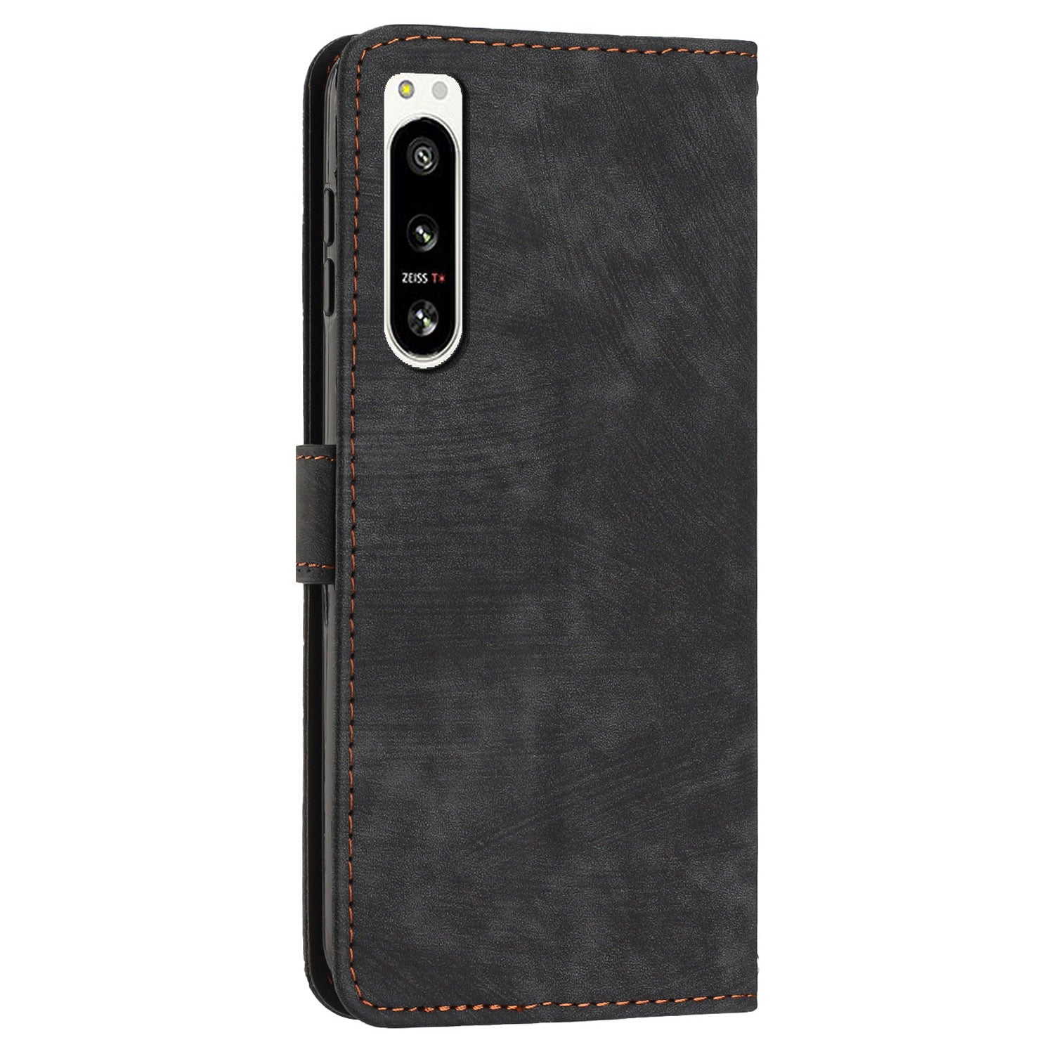 For Sony Xperia 5 IV 5G Lines Imprint Phone Case PU Leather Wallet Stand Anti-drop Cover with Shoulder+Wrist Strap