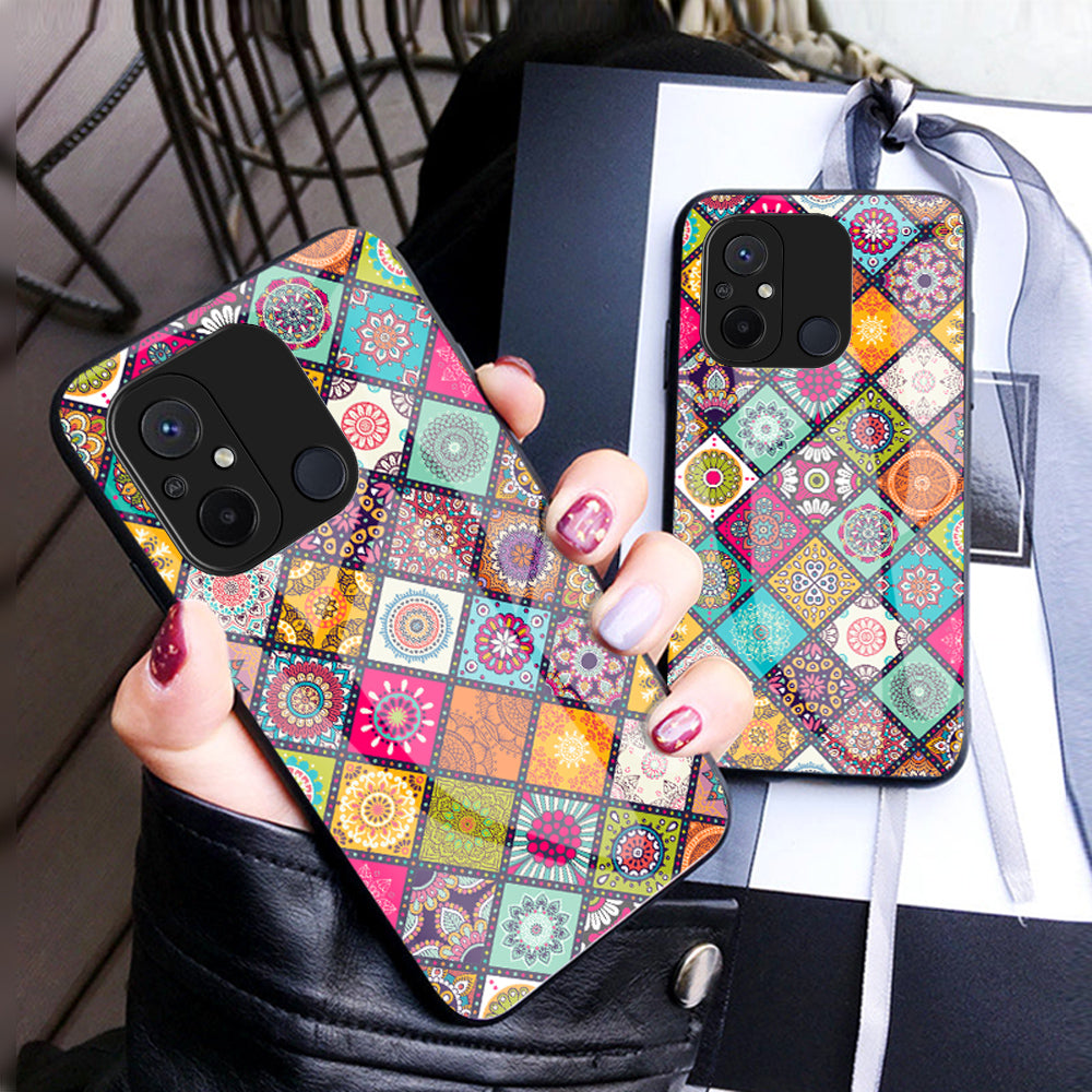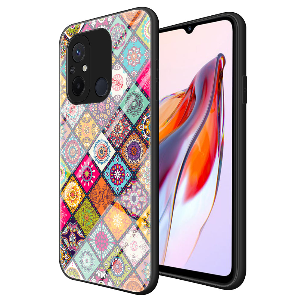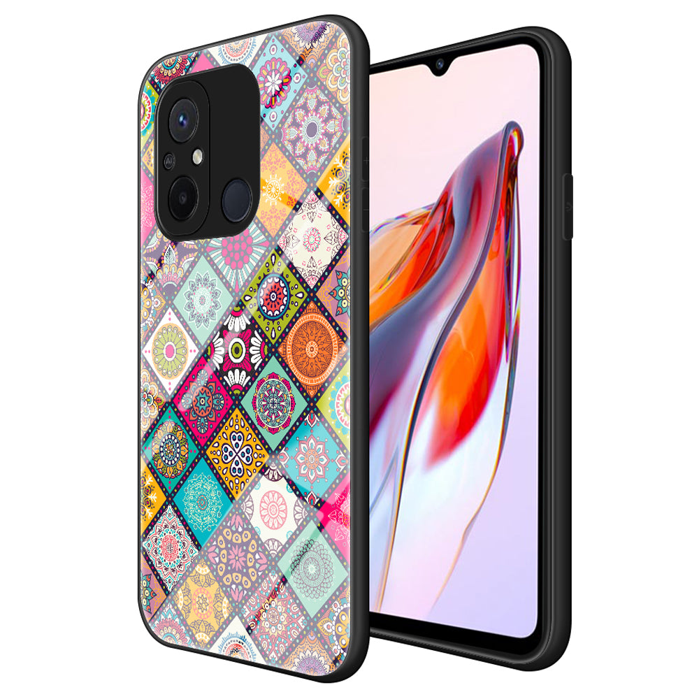 For Xiaomi Redmi 12C 4G Anti-Scratch Tempered Glass Back Cover Flower Pattern PC+TPU Kickstand Phone Case with Lanyard