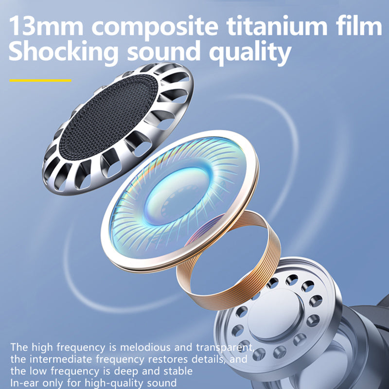 - 13mm Composite Titanium Film Shocking Sound Quality: The high frequency is melodious and transparent the intermediate frequency restores details, and the low frequency is deep and stable In-ear only for high-quality sound