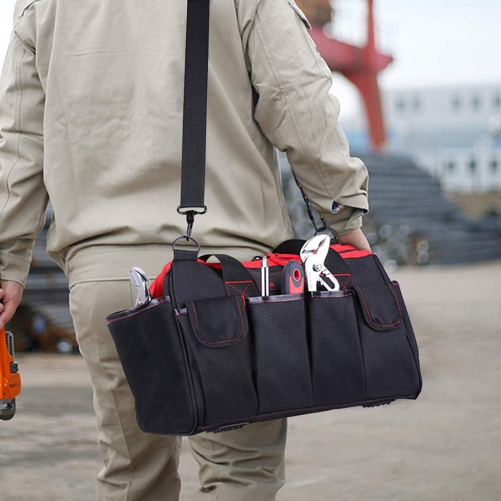 - Large Capacity - Meterk 16 Inch tools bag boasts 8 inside sturdy pockets and 9 exterior pockets for easier and clearer classification with more hand tools and accessories. Maximum load 70Kg, don't worry about getting damaged or breaking while in use