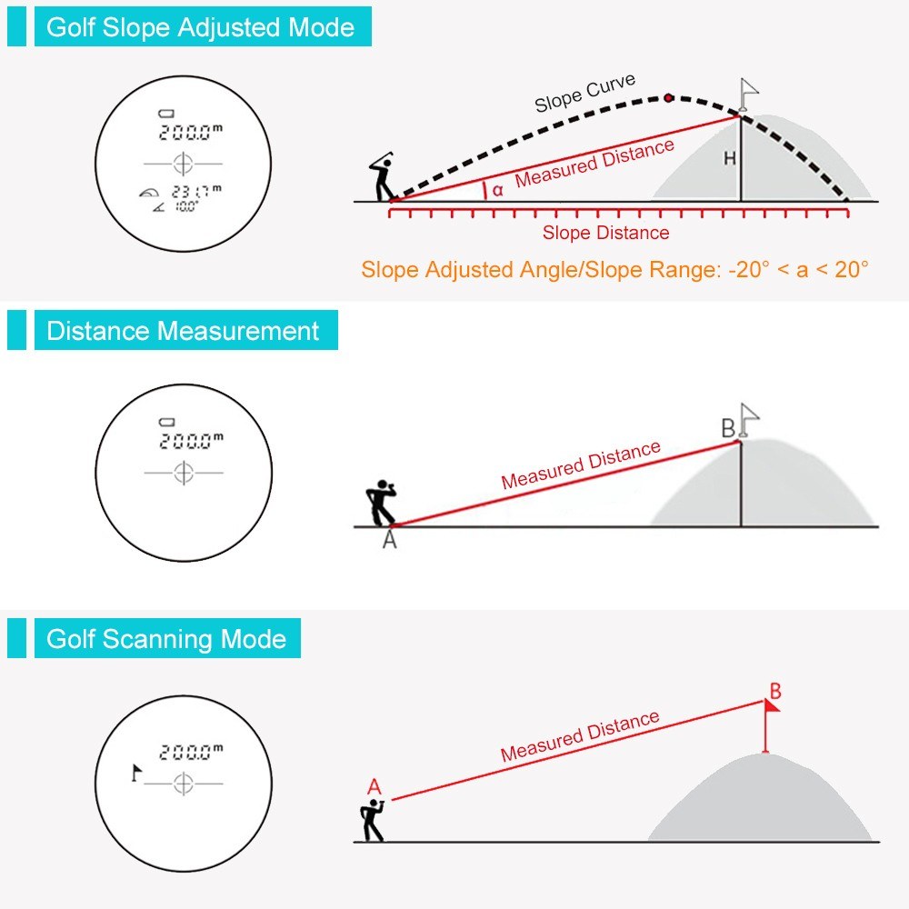 Professional range finder has various functions of Golf slop adjusted, Golf scanning, Two-point height measuring, Auto height, Auto level(Hor), and Speed measuring, etc, which can be widely used in hunting, archery, outdoor adventure, golf, construction survey, etc.