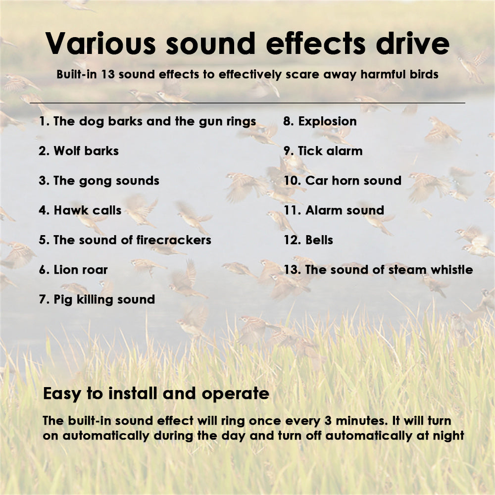 - Function: Automatic power on during the day interval of 3mins to broadcast a number of built-in sound cycles, automatic shutdown in the dark