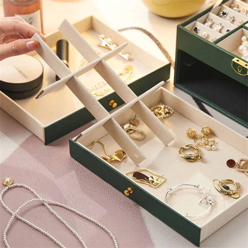 Rhombus Stitching Lines Three-layer Drawer Jewelry Lock Case Necklace Ring PU Leather Display Box, 23*17*13.5cm