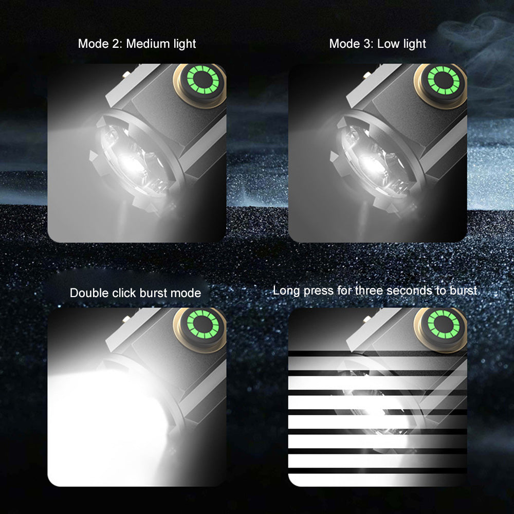 - Lighting mode: high light/medium light/low light/double-click very bright/long press three seconds burst flash