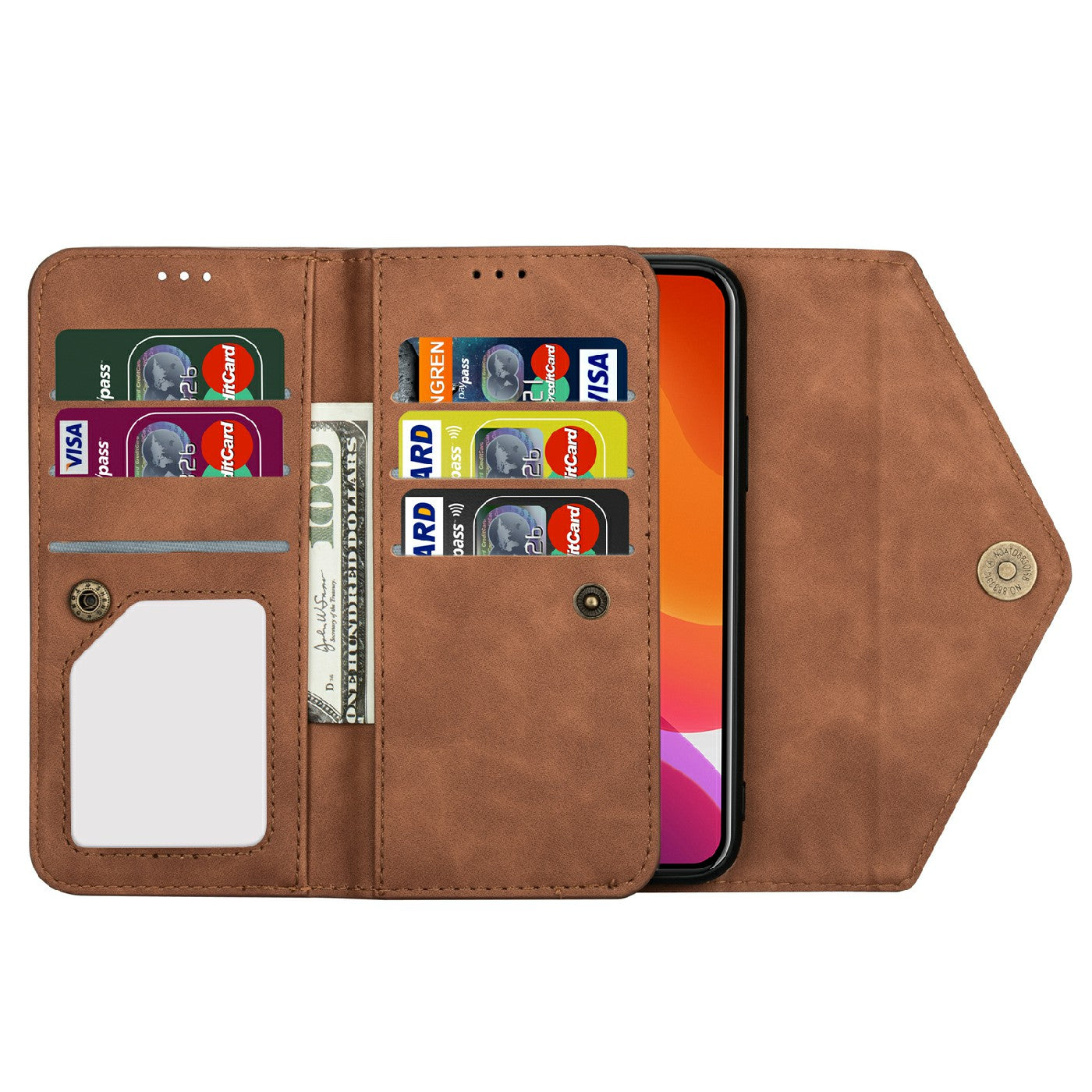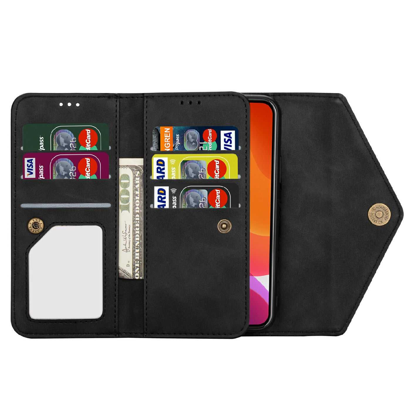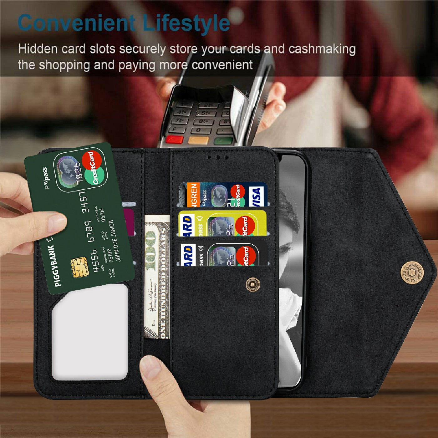 - Multiple card slots and cash pockets to conveniently store ID card, credit cards and money