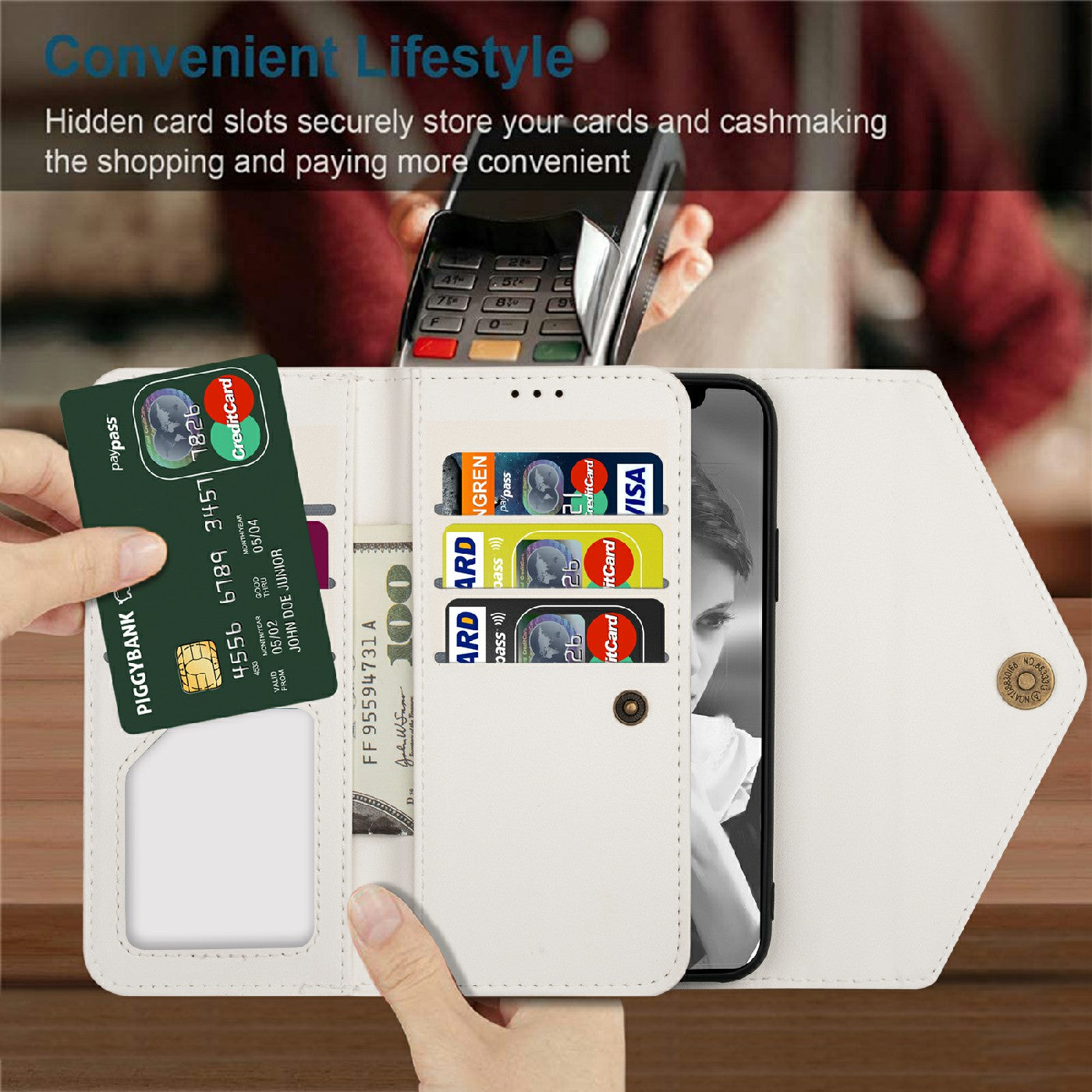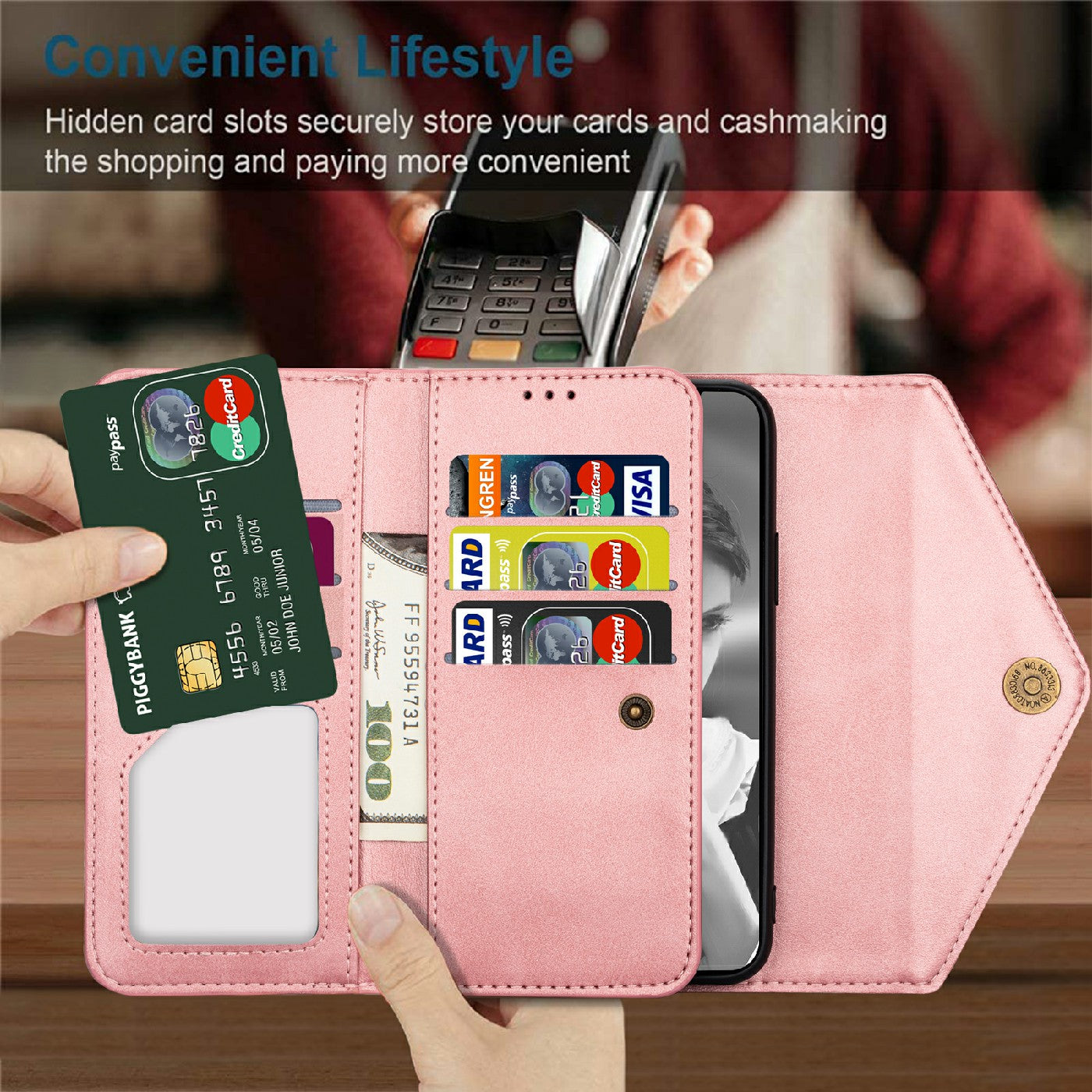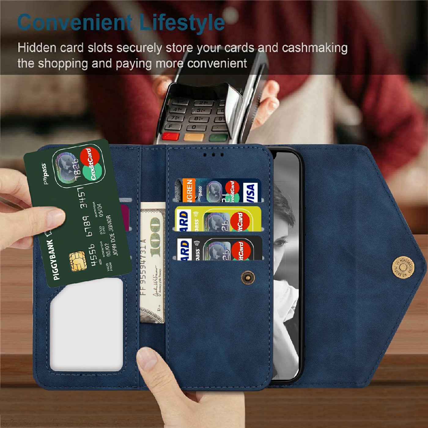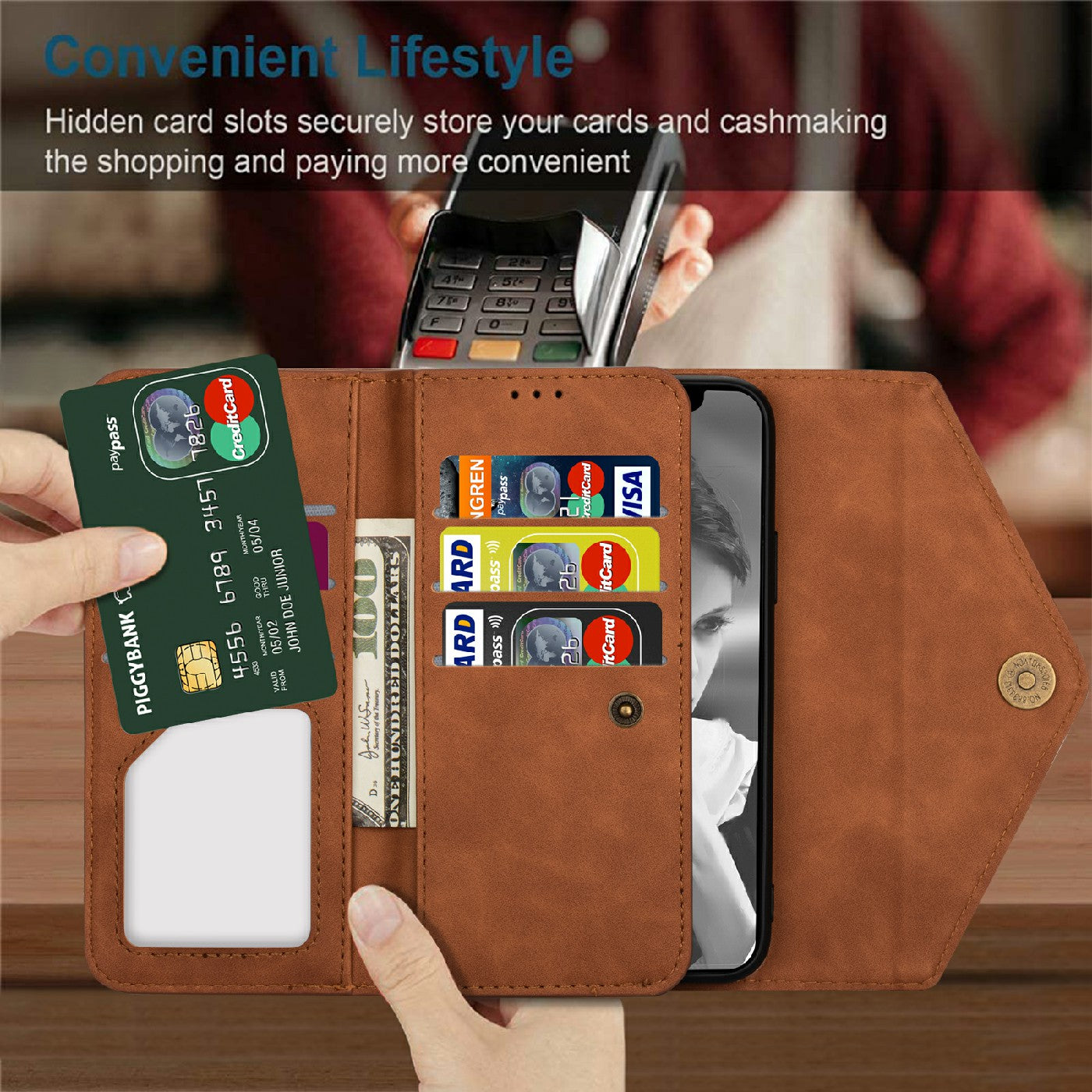 - Multiple card slots and cash pockets to conveniently store ID card, credit cards and money
