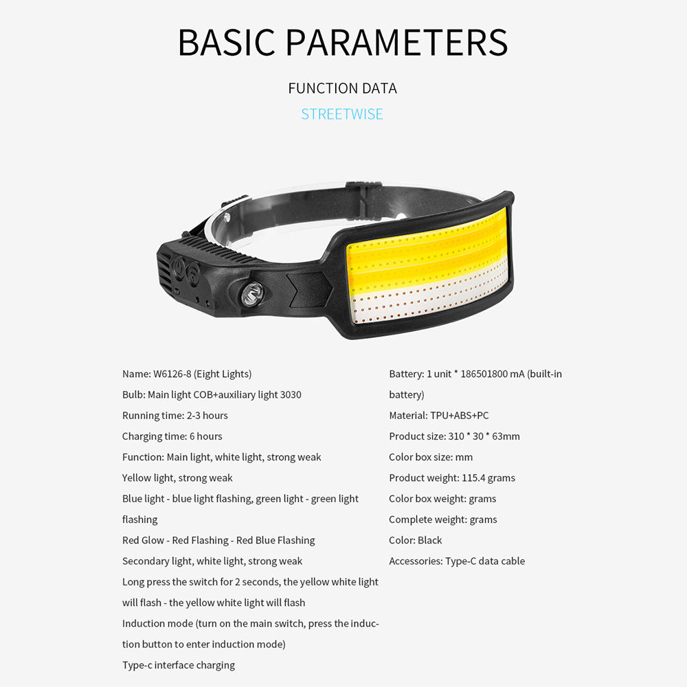 W6126-8 8 LED Light Stripes Head Lamp Multiple Lighting Color Headlamp Rechargeable Headlight for Night Running Fishing Camping