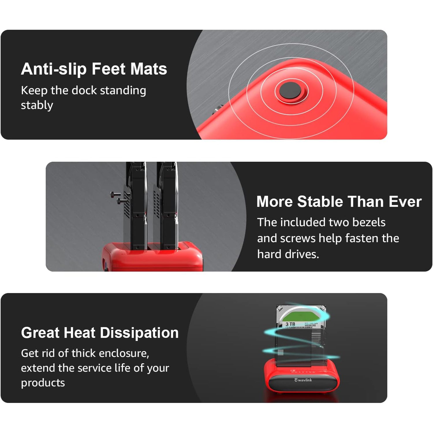 - Dual slot docking station: The Wavlink dual slot hard drive docking station supports all 2.5-inch/3.5-inch SATA I/II/III HDD SSDs (up to 2 x 16TB), making it the perfect solution for data backup and file transfer. The unique border design provides stable performance and better protection for the hard drive