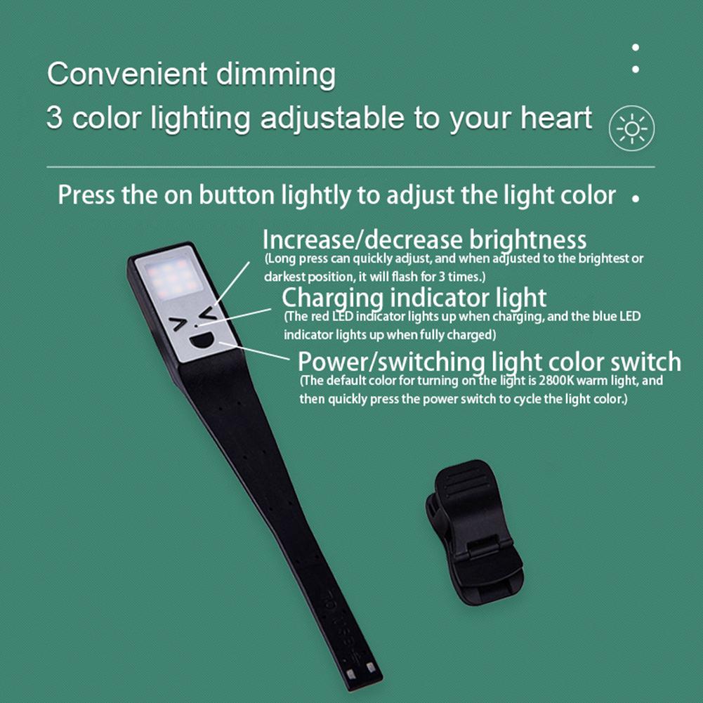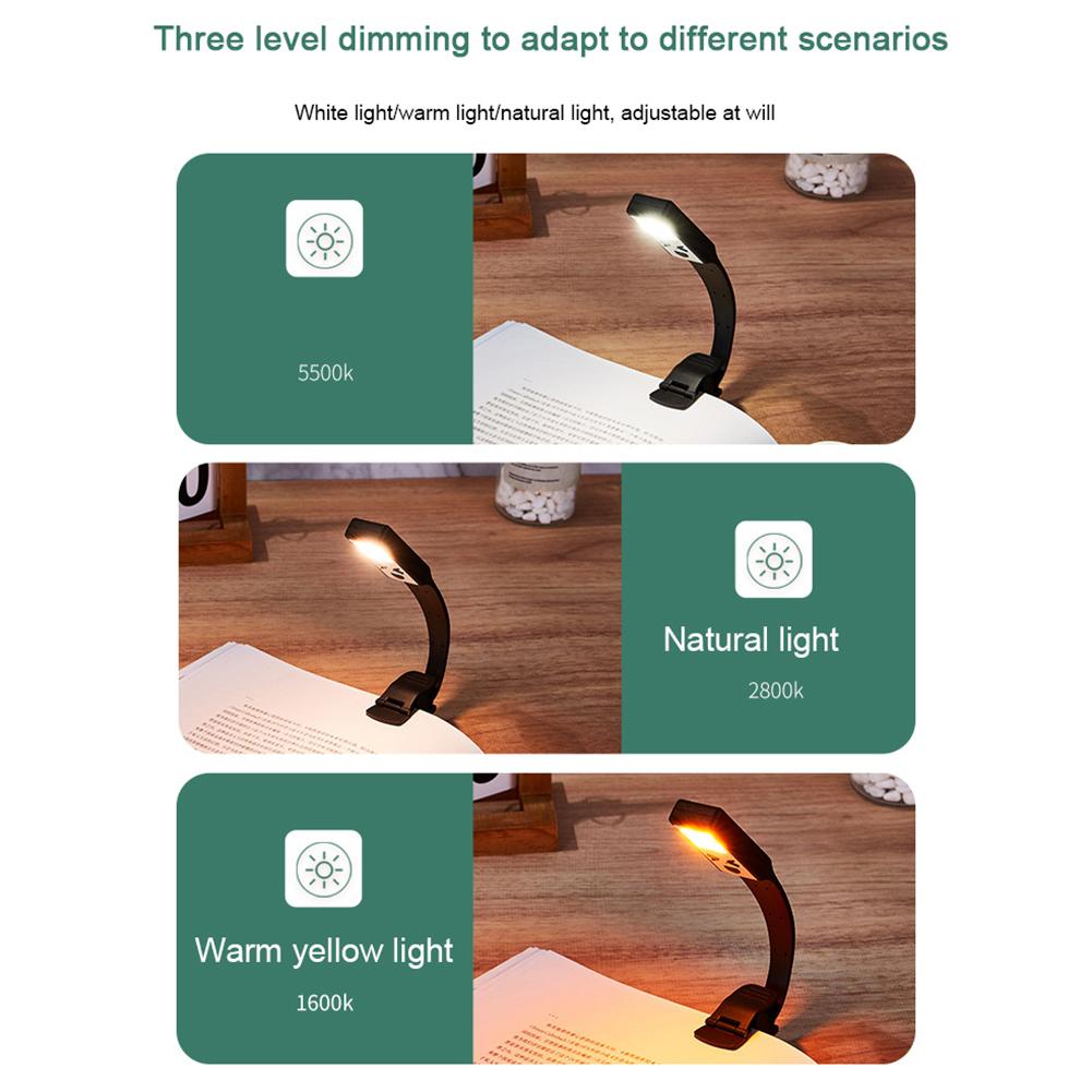 - Stepless dimming and 3 modes: The book lights used for reading in bed have a total of 9 lamp beads. Three different light colors: warm yellow light (1600K), natural light (2800K), and bright white light (5500K)